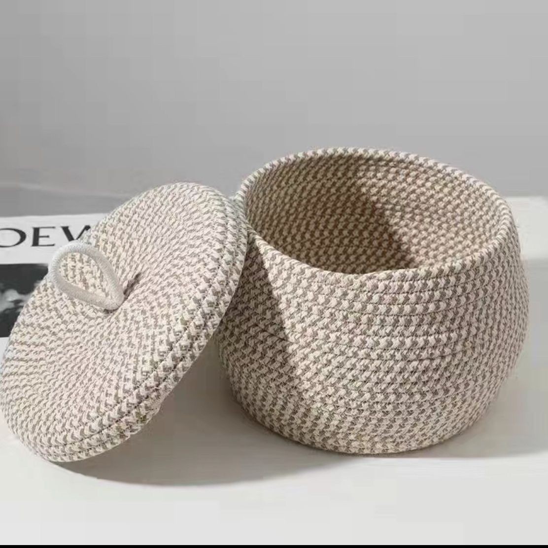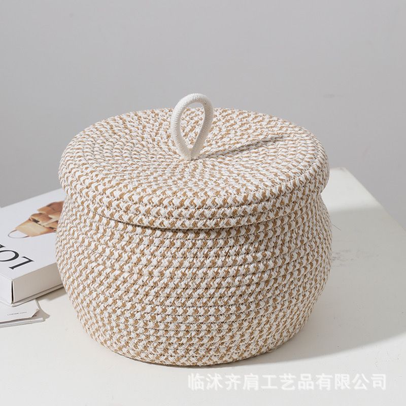 新款圆形编织收纳筐手工带盖防尘棉绳编织篮子桌面杂物零食鸡蛋筐