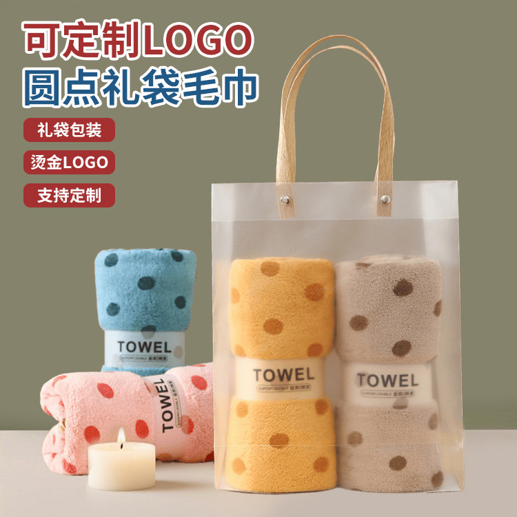 ギフトタオル、コーラルフリースドット柄タオル、刺繍ロゴ入り、ホリデーギフトタオル、ギフトボックス、カスタムメイド