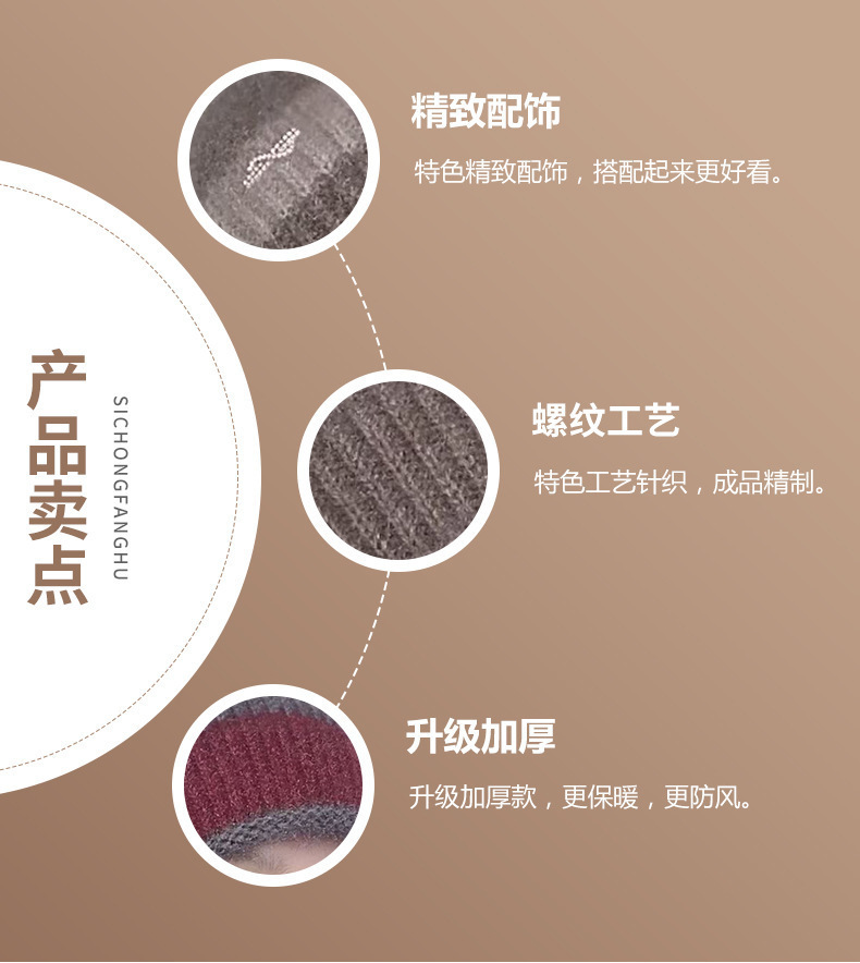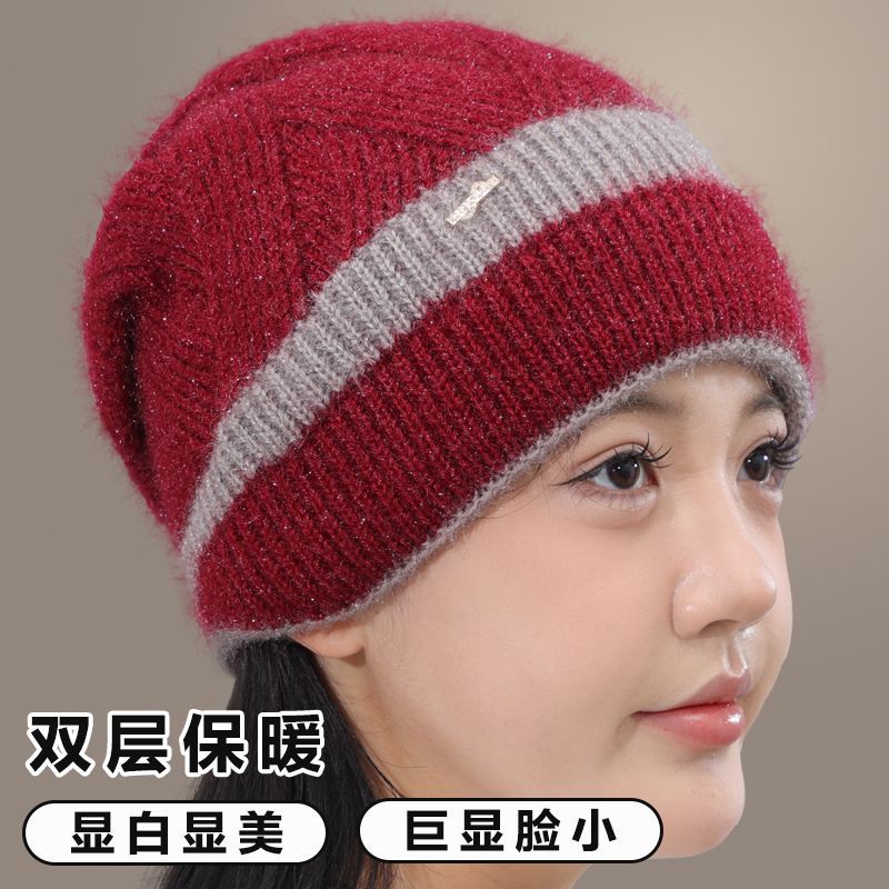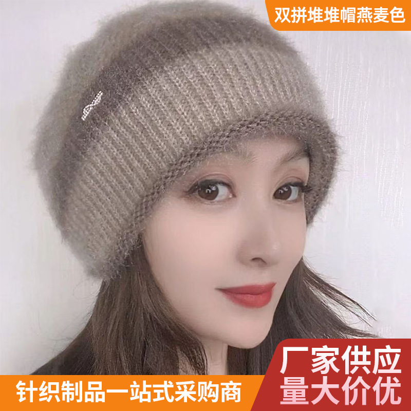 秋冬中老年毛线帽子加厚双层护耳堆堆帽拼色时尚女帽