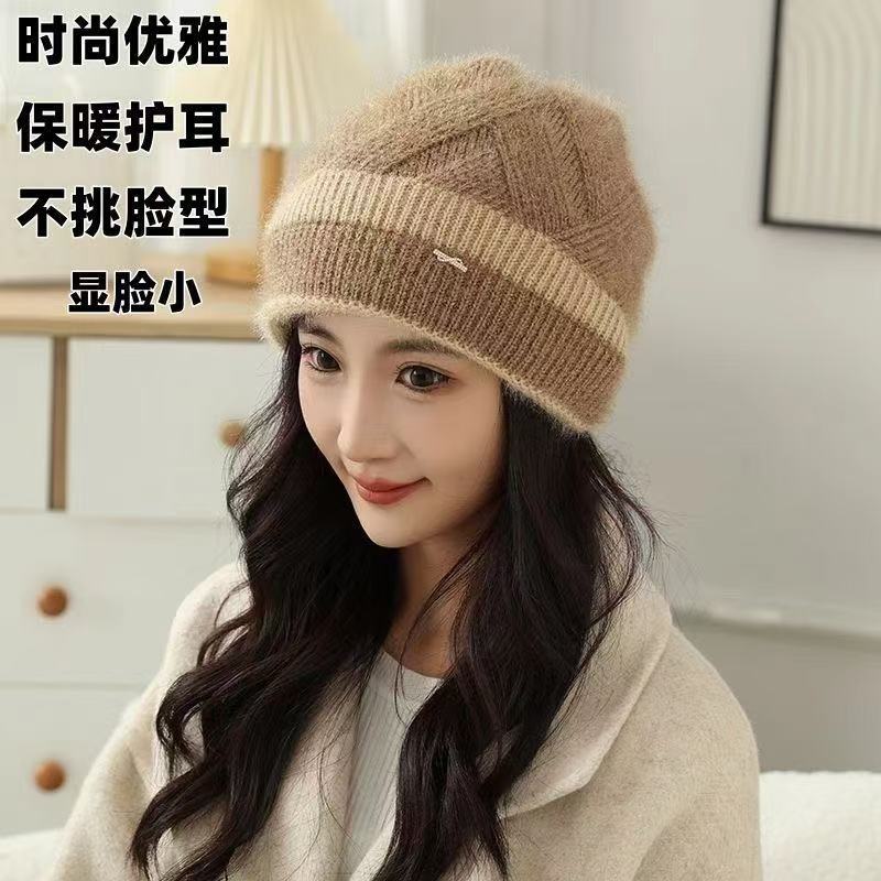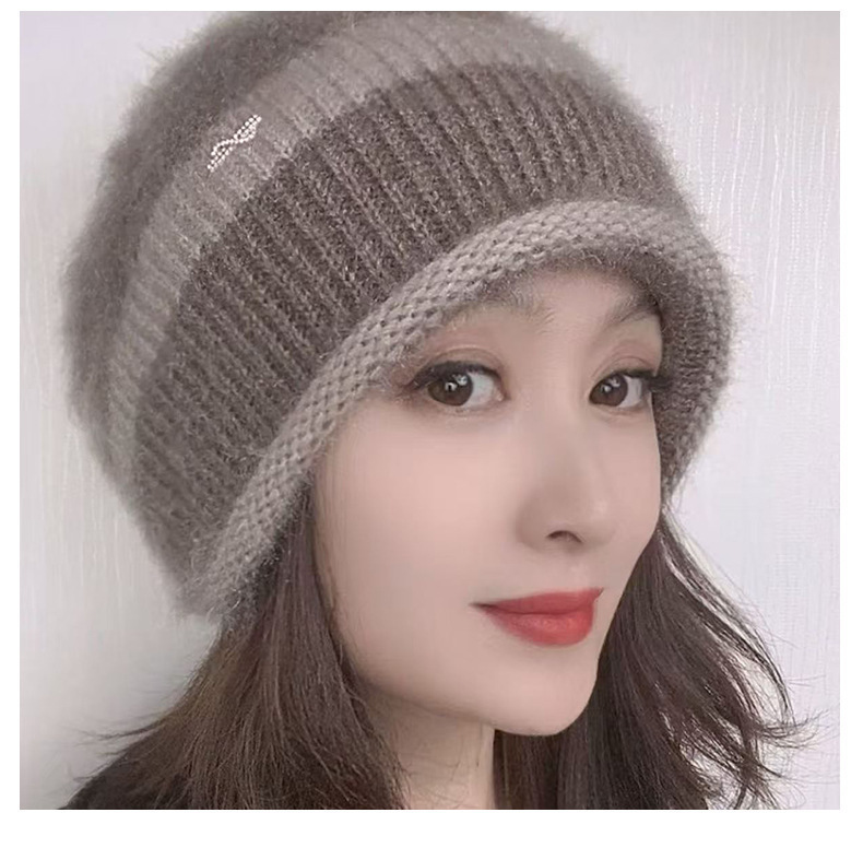 冬季新款松鼠针织时尚百搭撞色条纹蓓蕾女帽双层加厚保暖帽子拼色