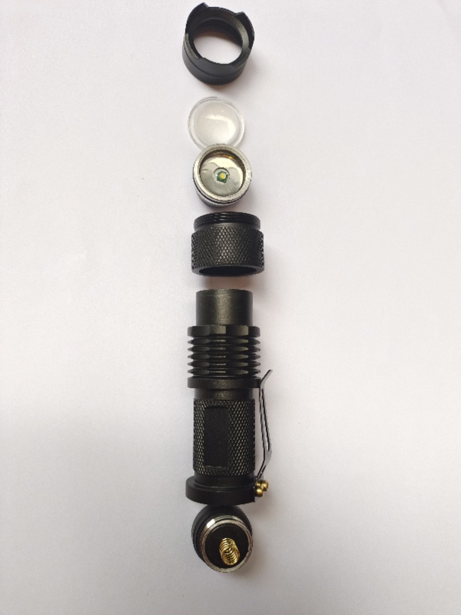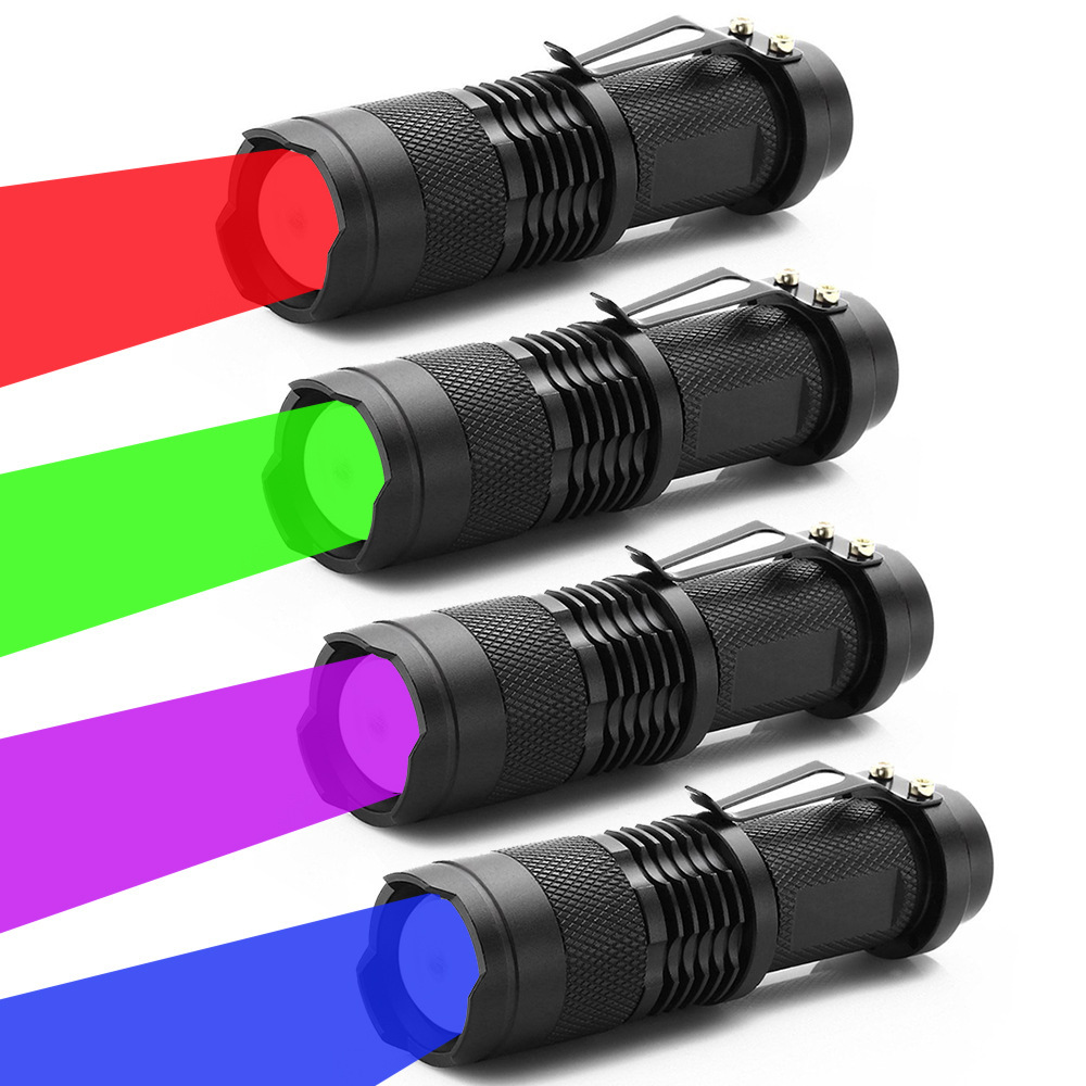 黒色のオールアルミ製懐中電灯(白色光),オレンジ色のオールアルミ懐中電灯(白色光),冷白色光(電池は付属しません),紫色の光 395nm (電池は付属しません),紫色の光 365nm (電池は付属しません),緑色の光 525nm (電池は付属しません),赤色光 625nm (電池は付属しません),ブルーライト 450nm (電池は付属しません)