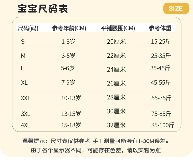 身長に適した Sサイズ 1~3歳 7.5-12.5kg,Mサイズ 3~5歳 12.5-17.5kg,Lサイズ 5~6歳 17.5-22.5kg,XLサイズ 7-9歳 22.5-27.5kg,2XLサイズ 9-13歳 27.5-37.5kg,3XLサイズ 13-14歳 37.5-42.5kg,4XLサイズ 14-17歳 42.5-52.5kg