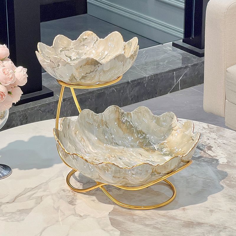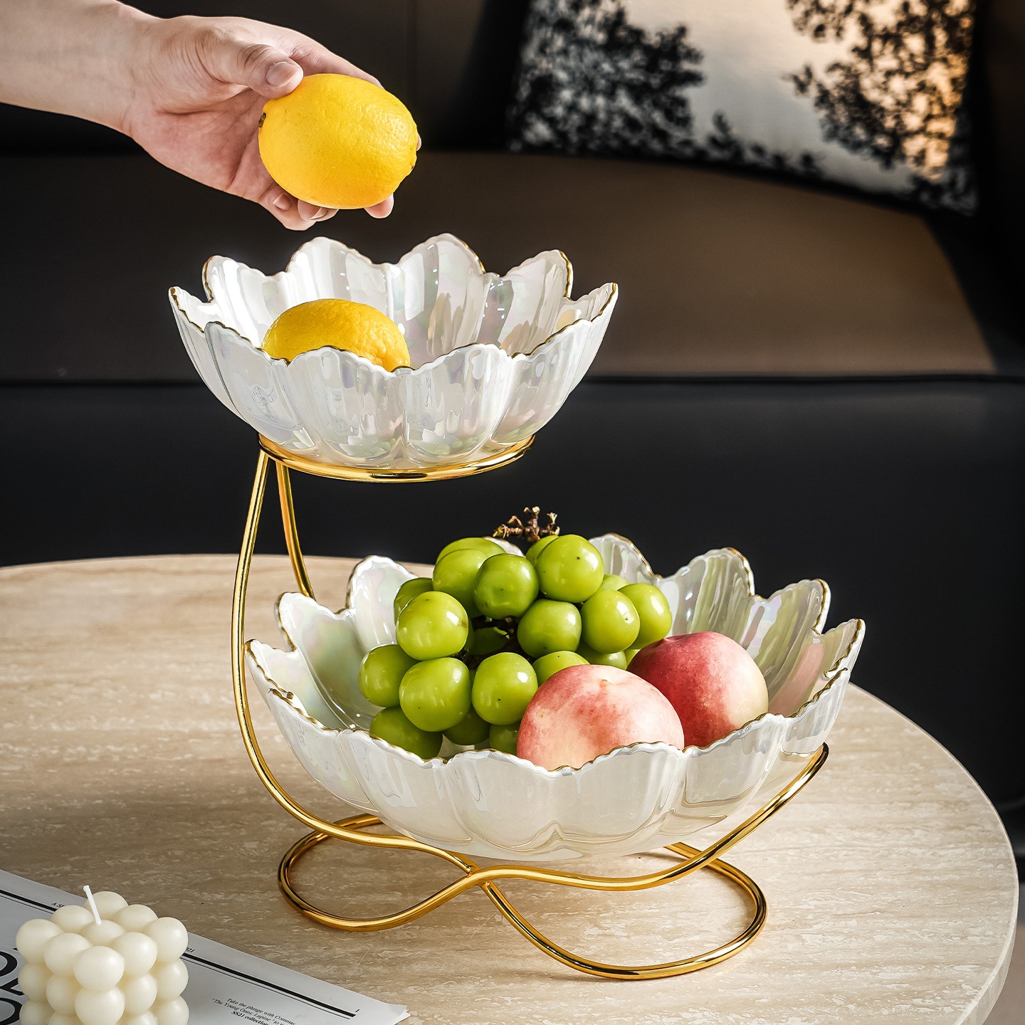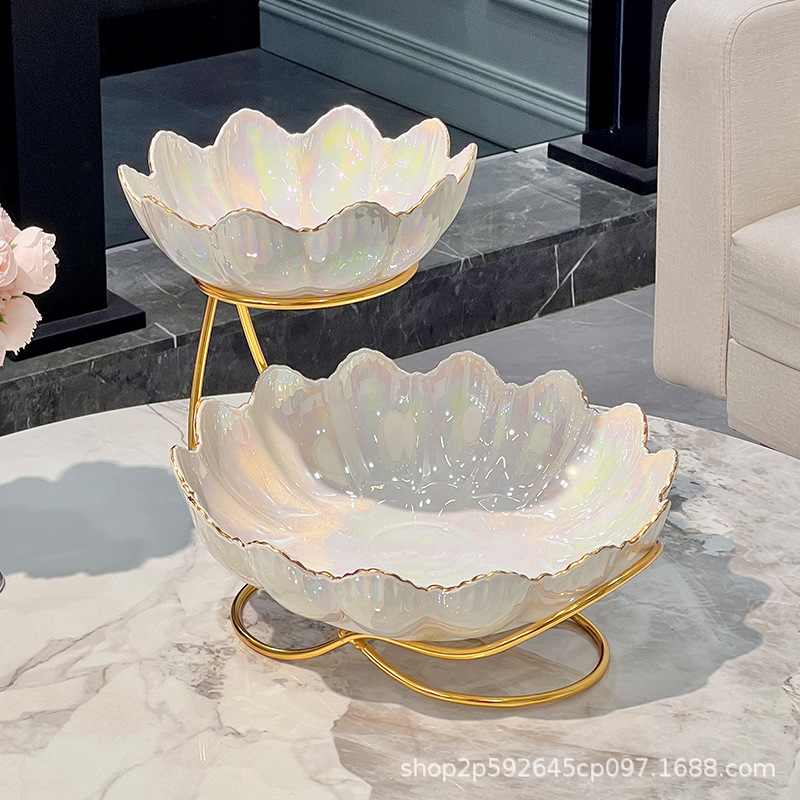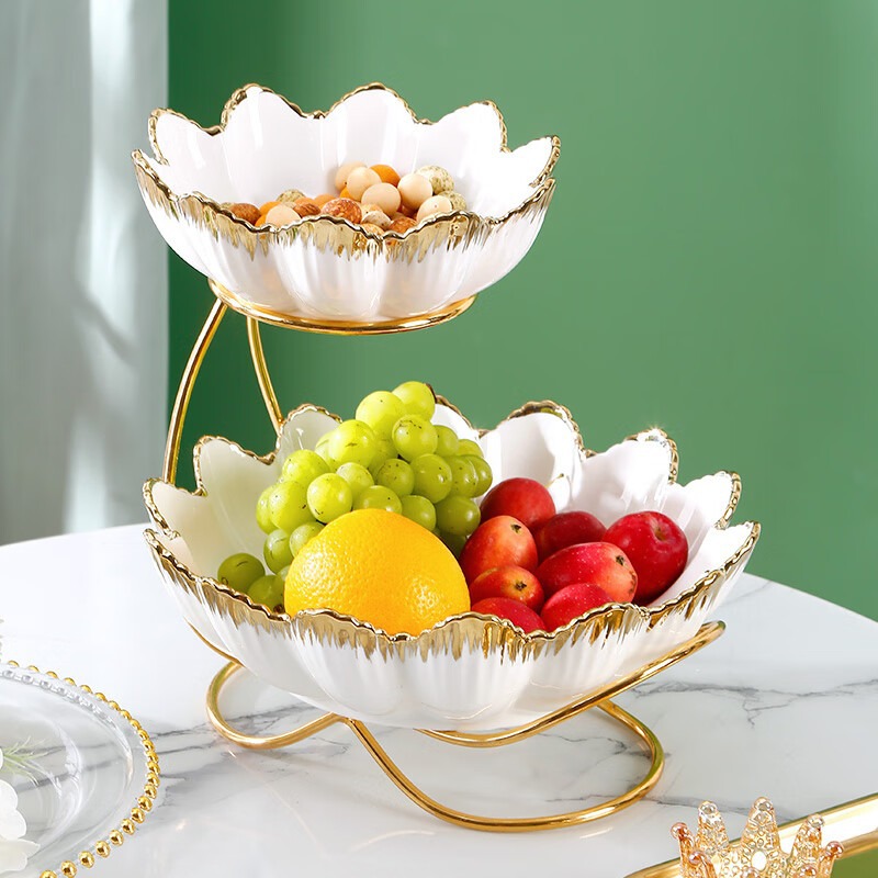 双层果盘家用酒店自助餐厅陶瓷零食盘水果盘轻奢简约花瓣创意果篮