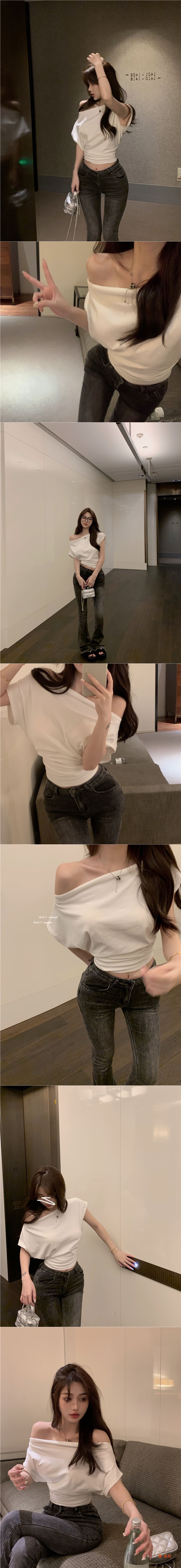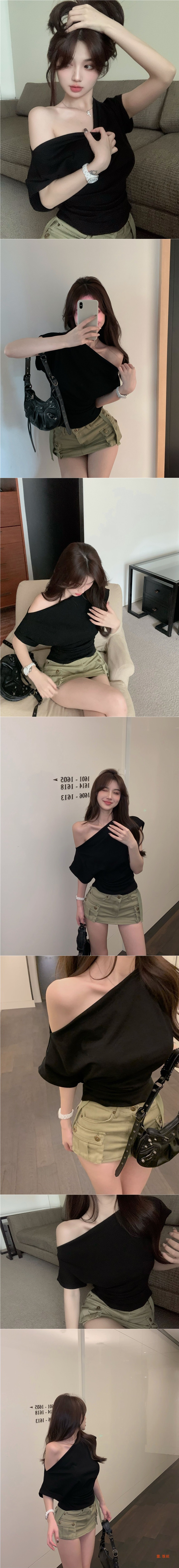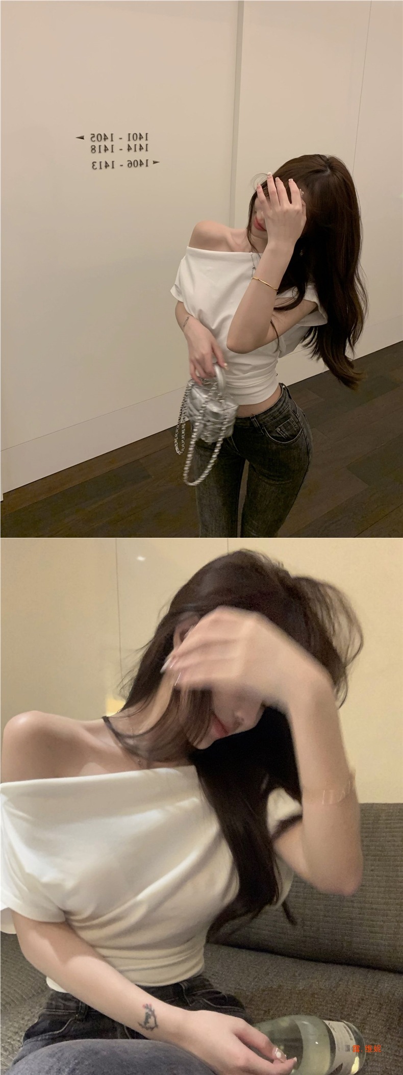デザインニッチTシャツレディース夏ショートホットガールオフショルダーシックな気質セクシーな痩身半袖トップ