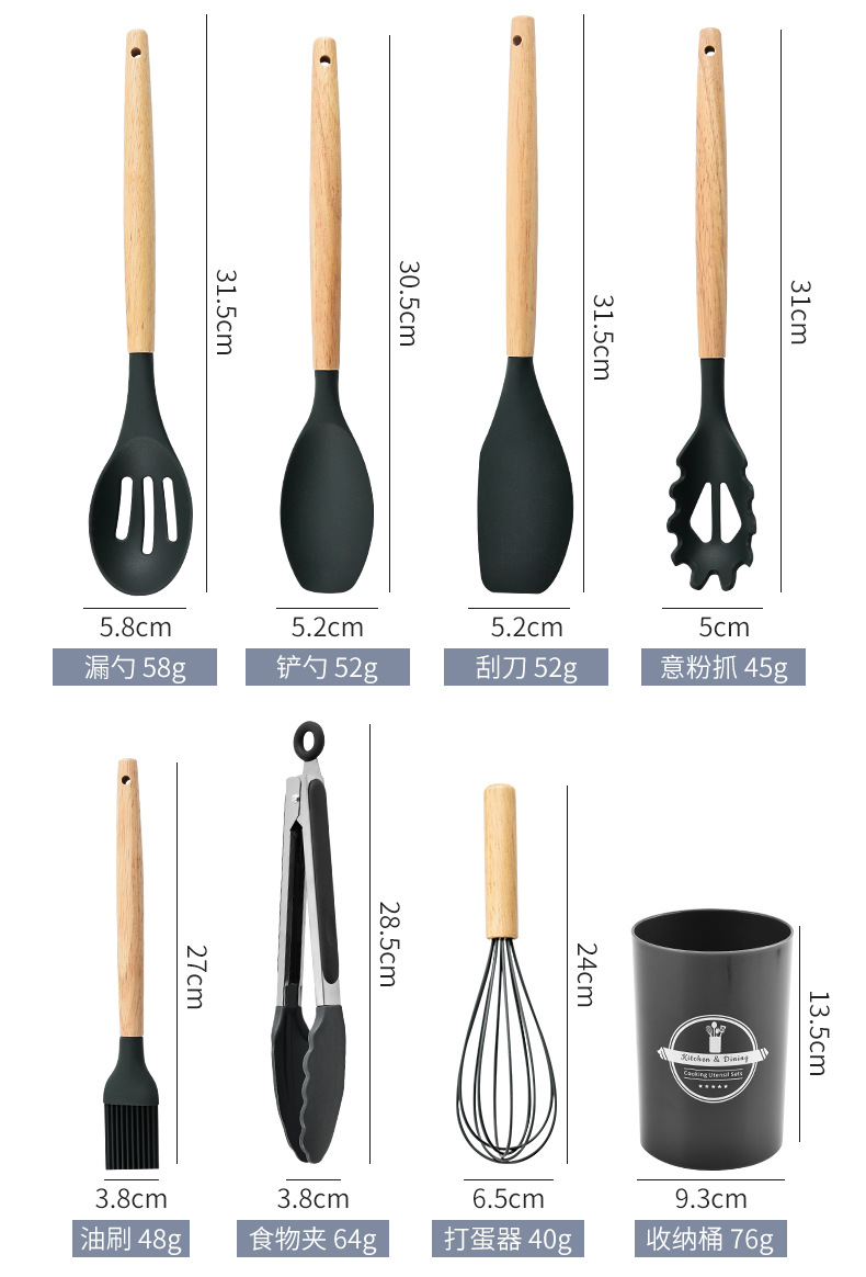 クロスボーダースポット木製ハンドルシリコン12点セット調理ノンスティックパンスキレット収納バケツキッチン用品セット食品グレードシリコン