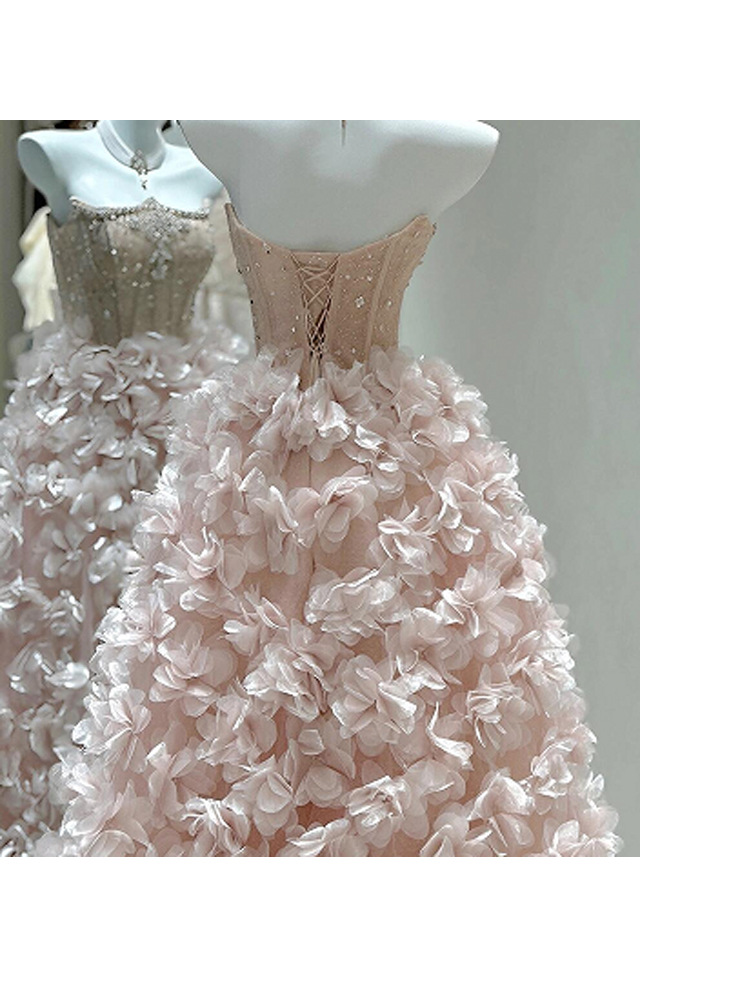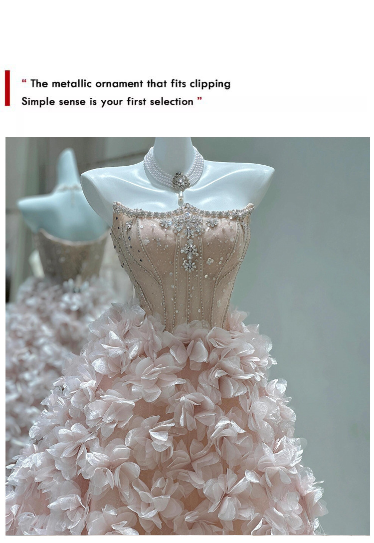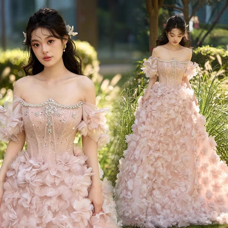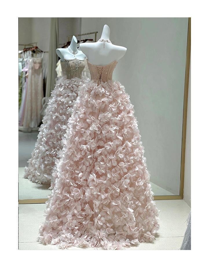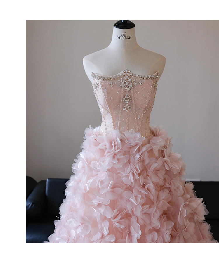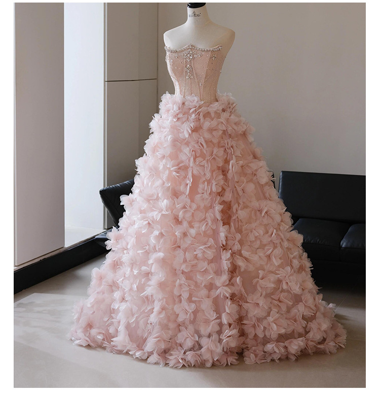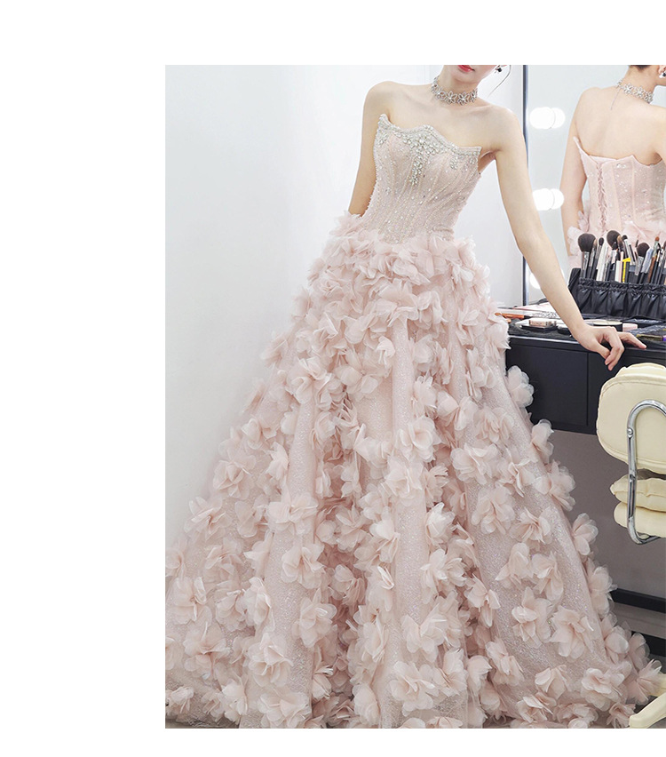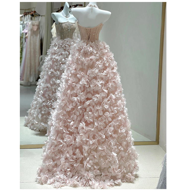 抹胸晚礼服裙女花朵粉色法式小众宴会生日派对新娘订婚结婚敬酒服