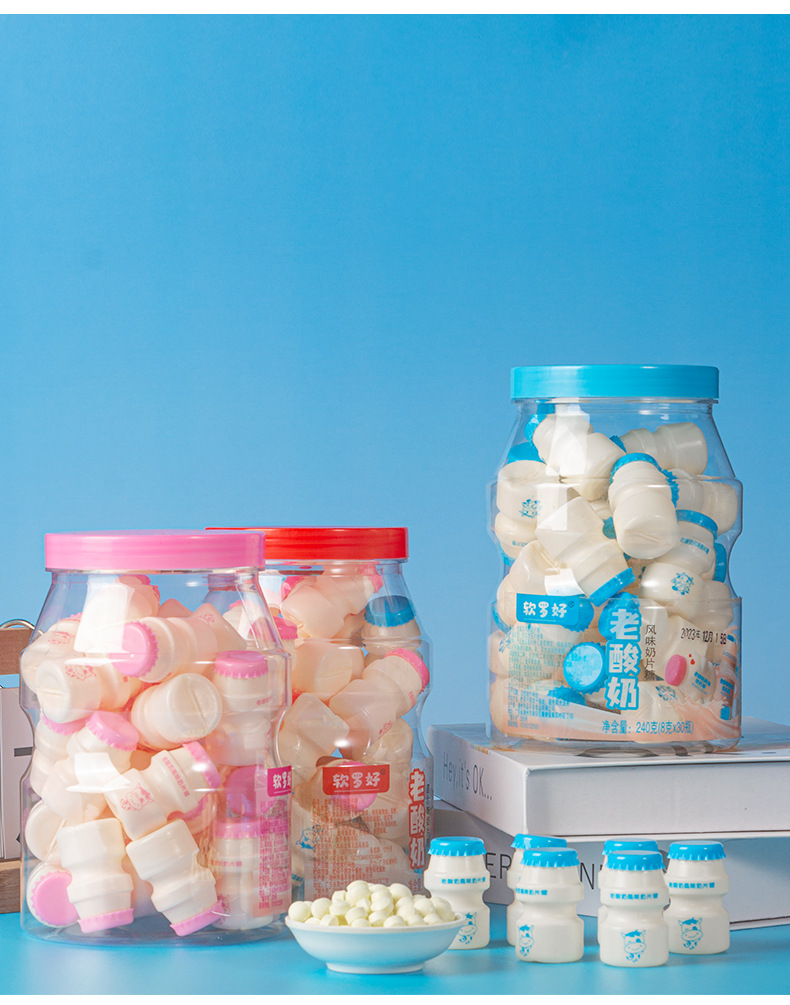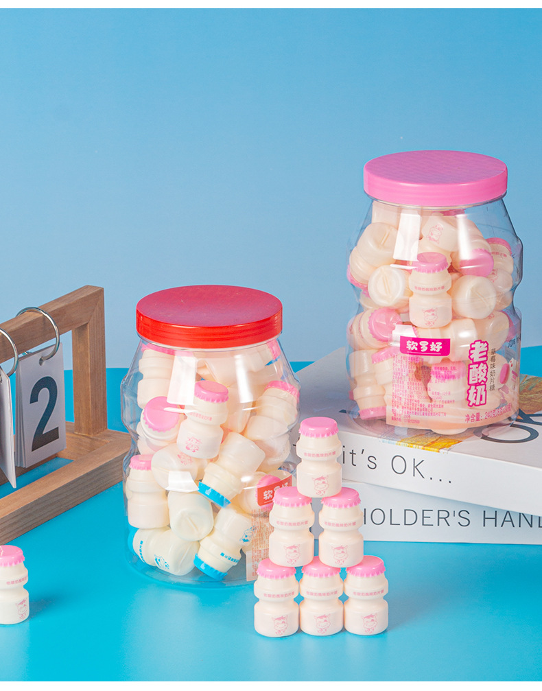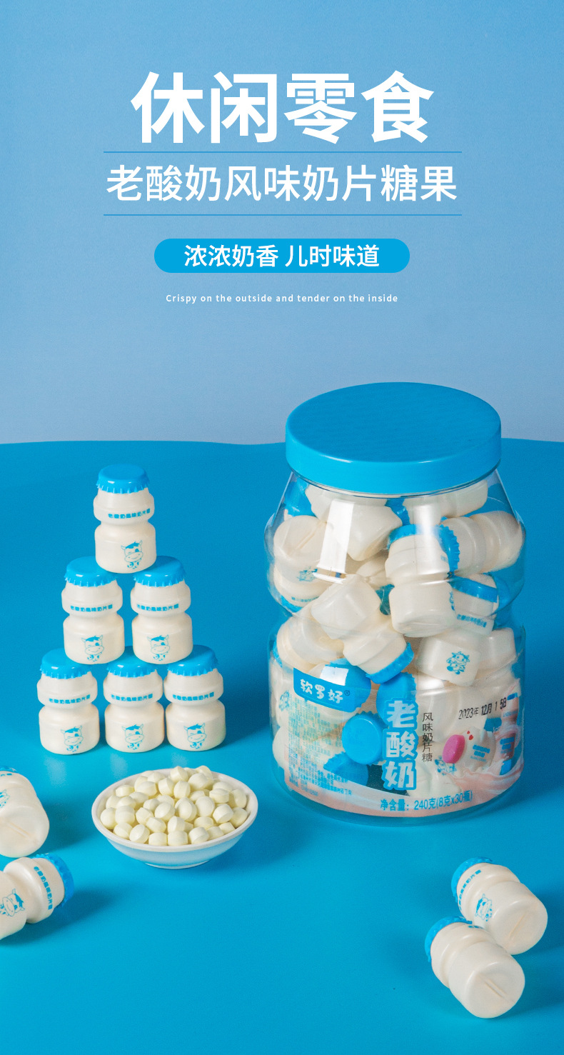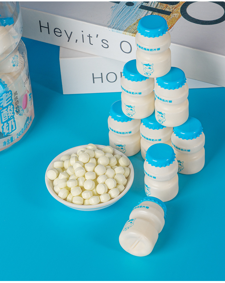 オールドヨーグルト風味のミルクタブレット、かわいいミニボトルのミルクキャンディー、個別包装、学校に必要なノスタルジックなおやつを持ち歩くのに最適