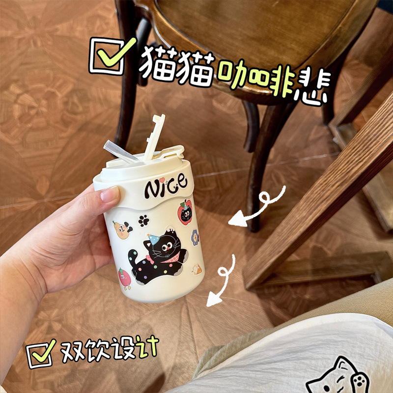 夏季猫咪双饮杯304不锈钢咖啡杯吸管随手杯子学生ins高颜值塑料杯