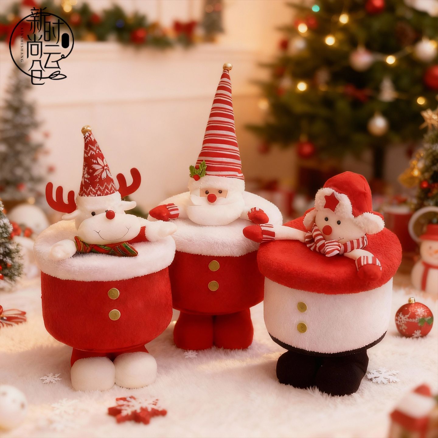 新款圣诞糖果零食收纳筐抱抱桶圣诞老人毛绒带盖礼盒圆盒花艺包装