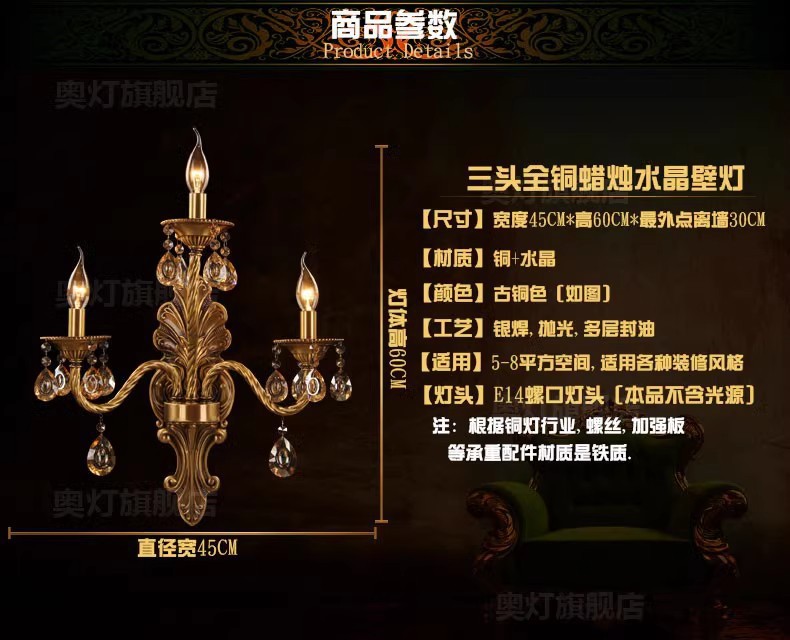 ヨーロッパ式の全銅の壁の明かりは古い客間の書斎の寝室のベッドの頭の水晶の背景の壁の壁の明かりを作ります。