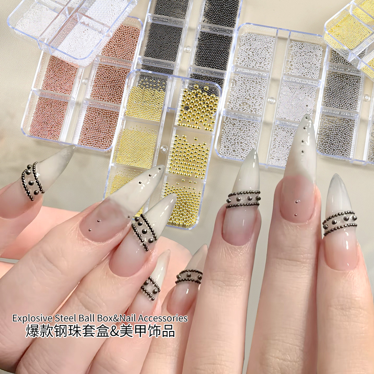 跨境新款6格盒混装美甲钢珠饰品金银色合金圆形珠子大小号混装