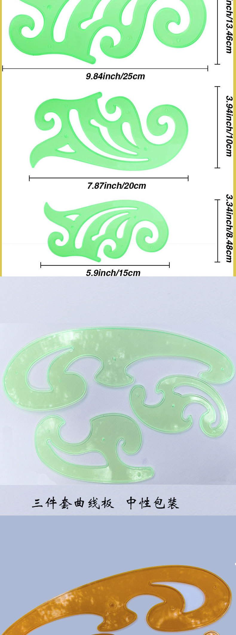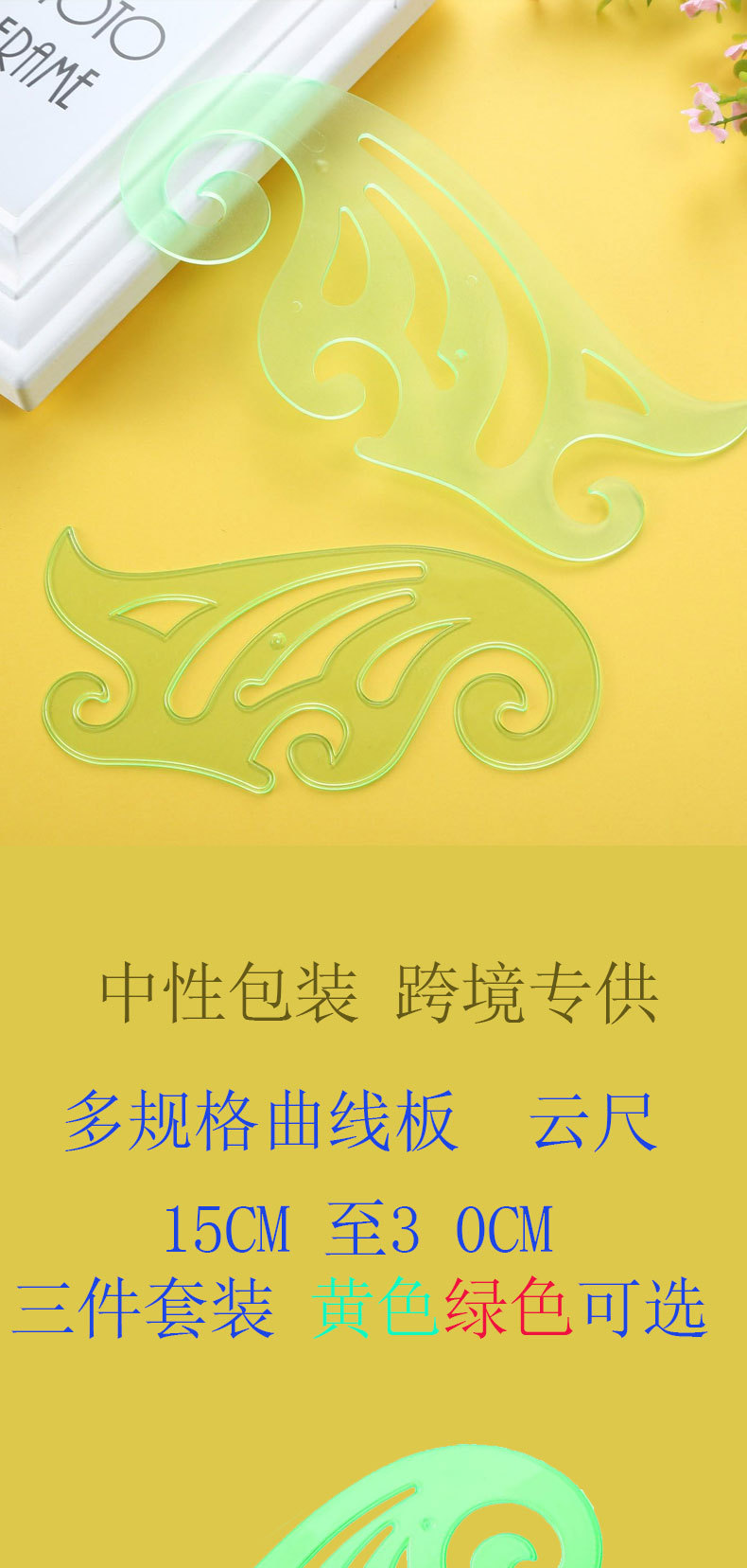 クロスボーダーは線板の三点セットで雲尺の多い規格の緑のテンプレートを詰めて曲線の定規を描きます。