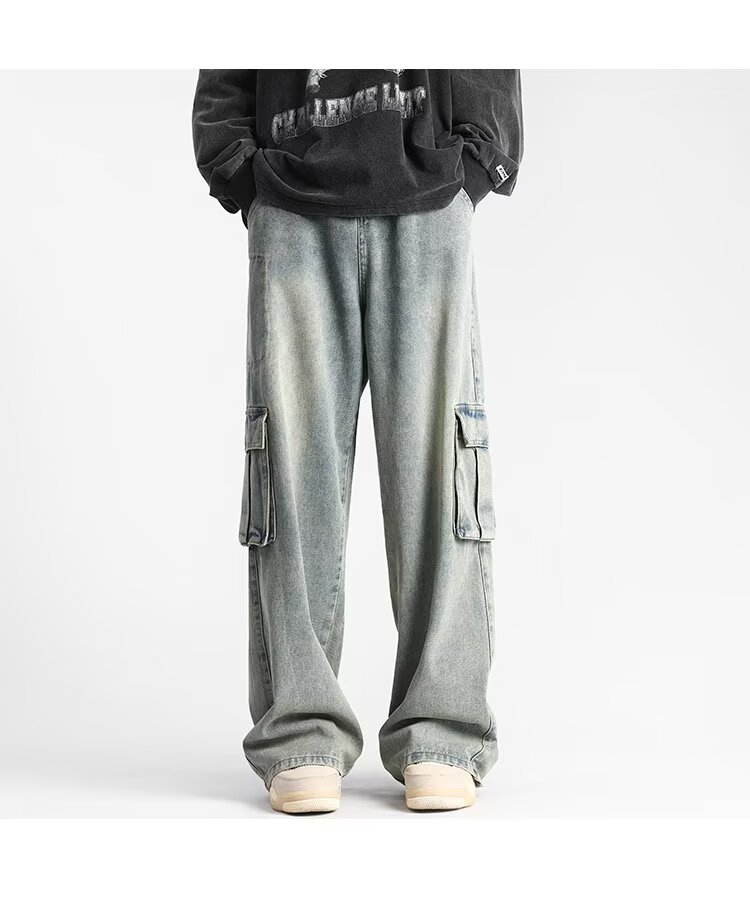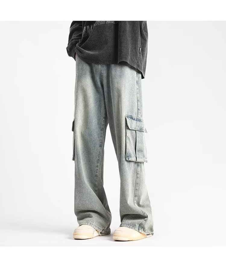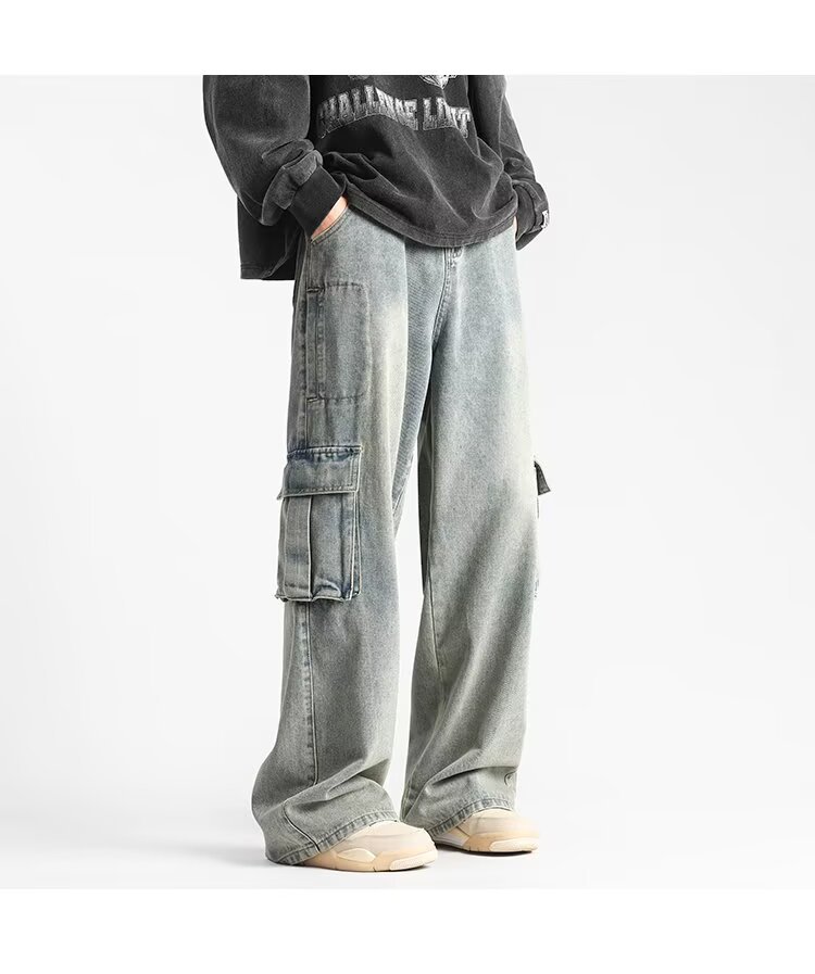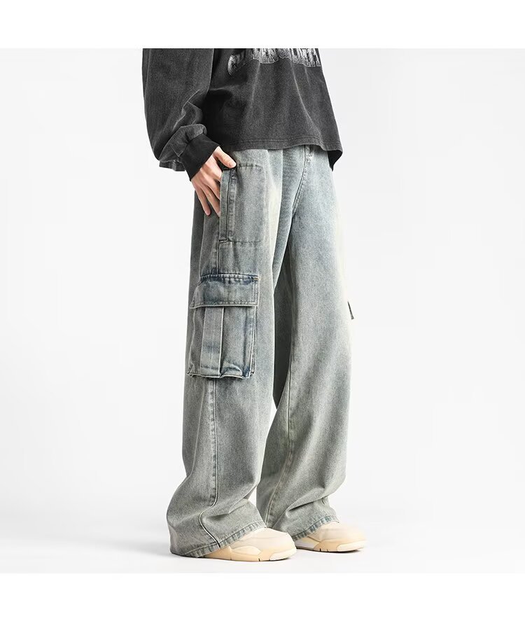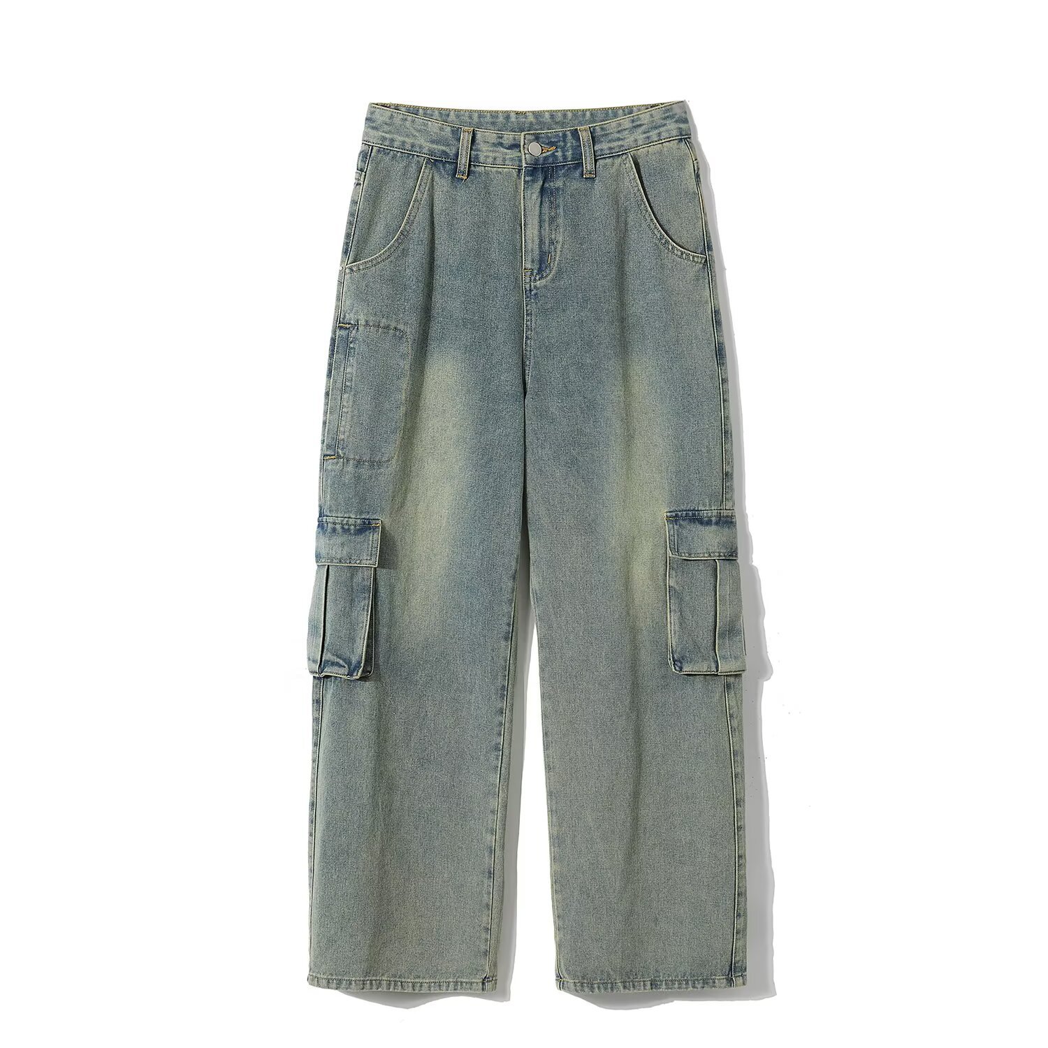 2025年春アメリカンハイストリートマルチポケットワークジーンズレディーストレンディなダメージ加工ストレートレッグ多用途ルーズワイドレッグパンツ