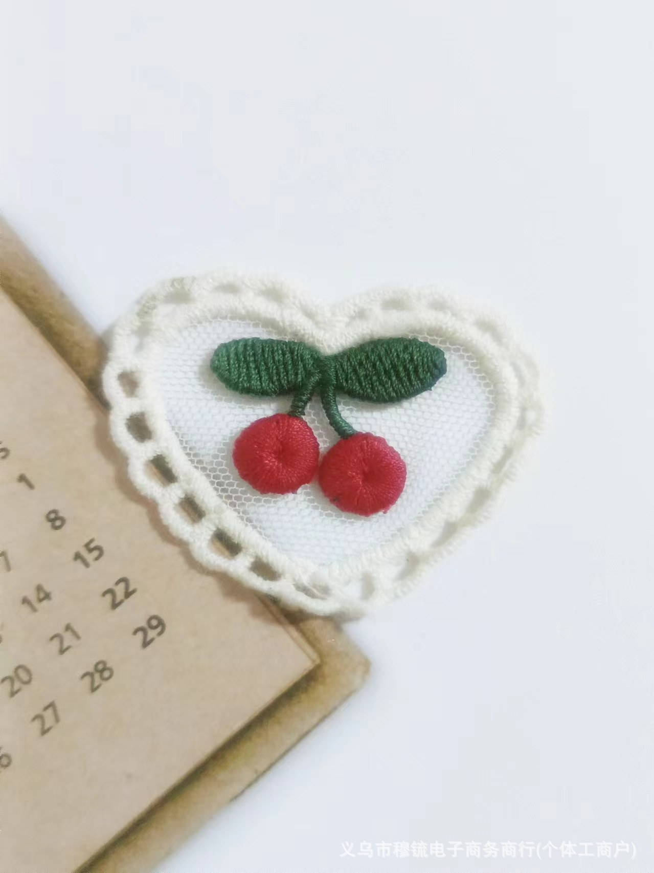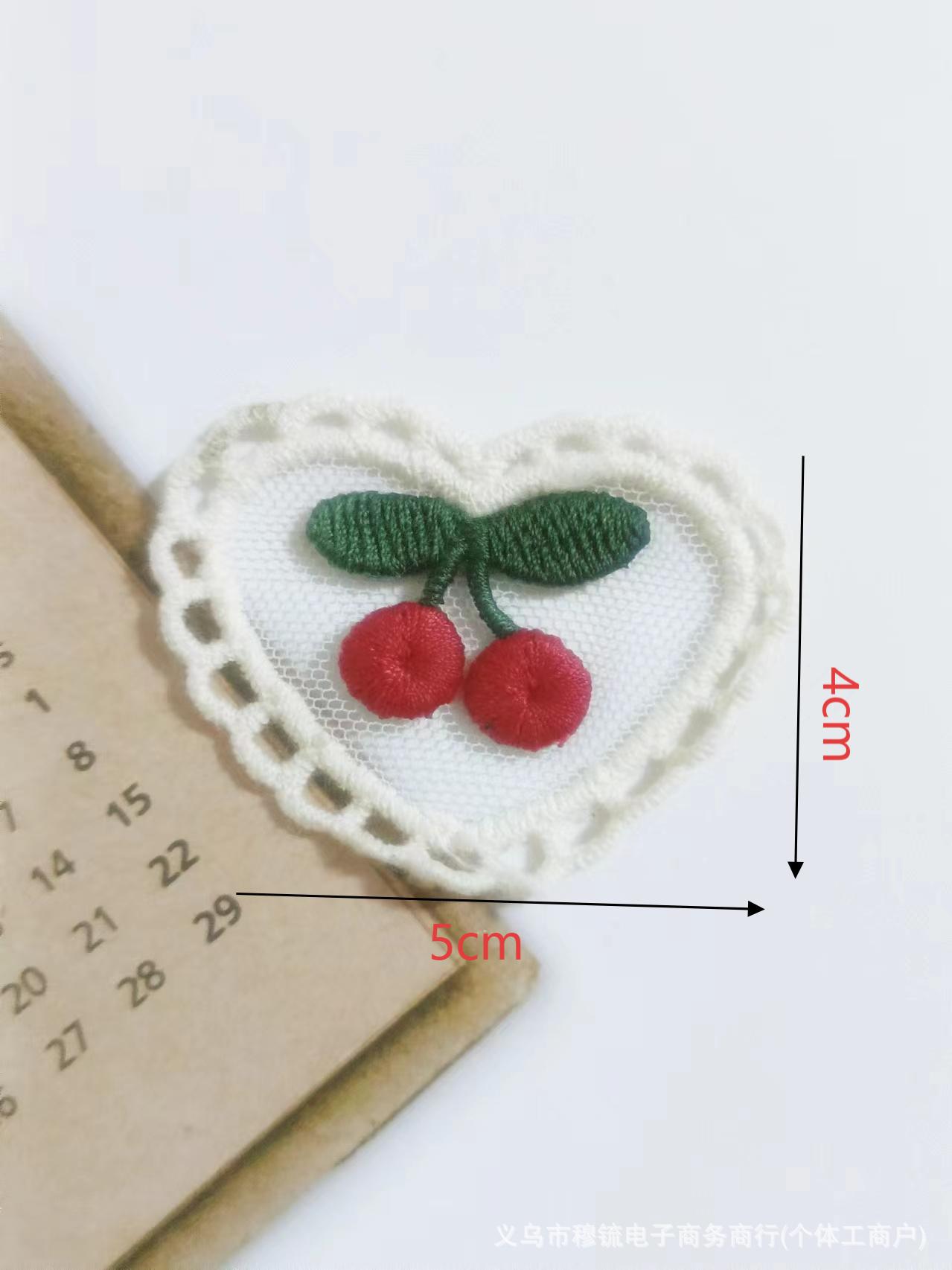 かわいい小さいさくらんぼの布は白いレースを貼ってハート型の透かし彫りの刺繍を貼ります。
