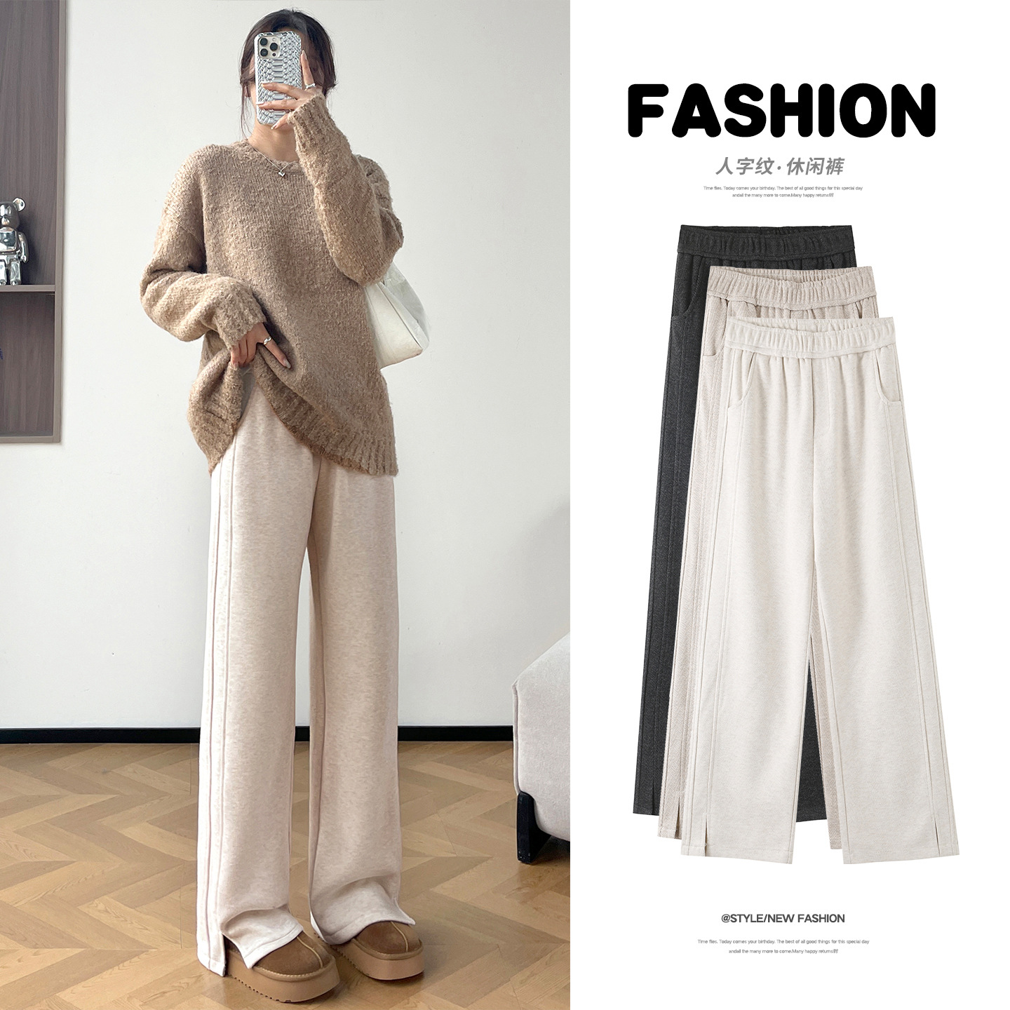秋季新款人字纹窄版阔腿裤女秋冬开叉高腰垂感小个子毛呢休闲裤