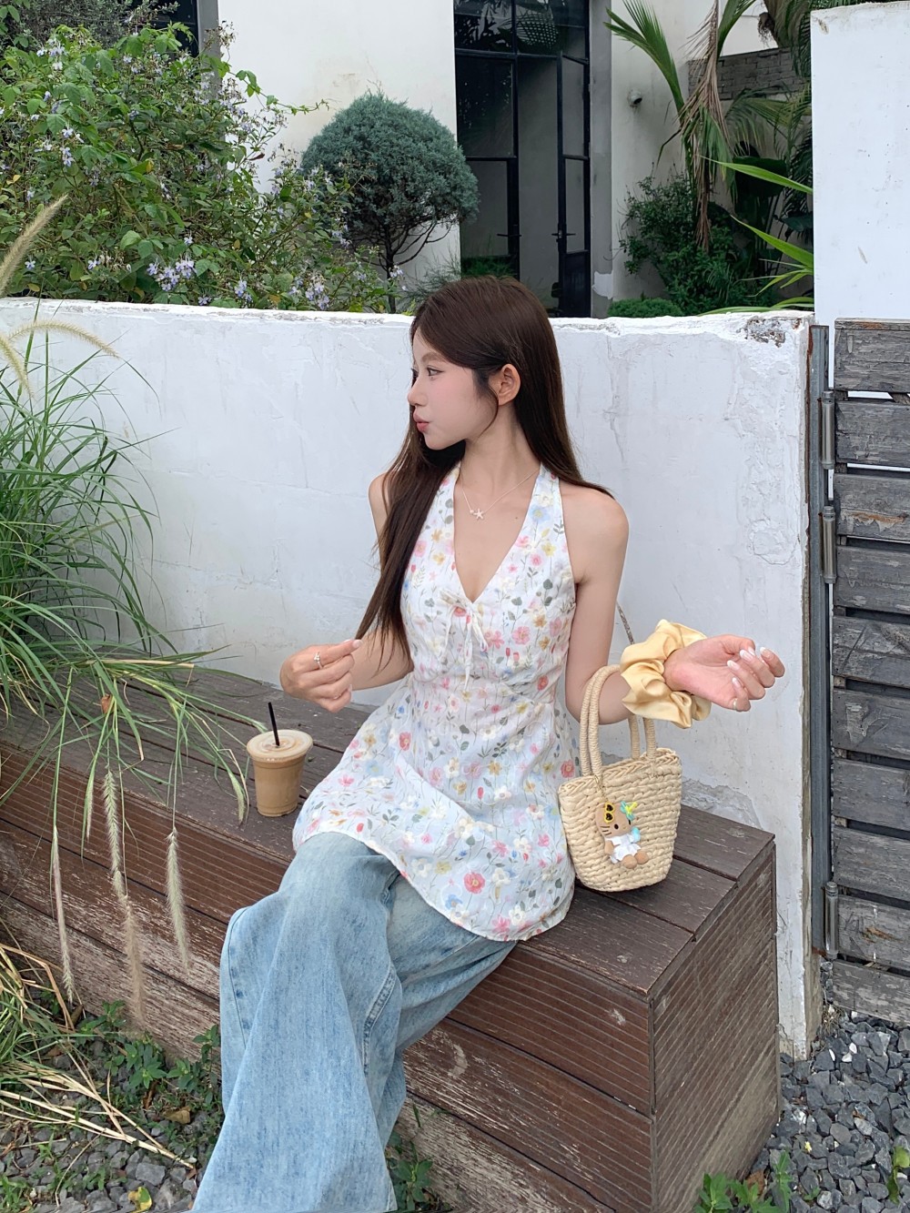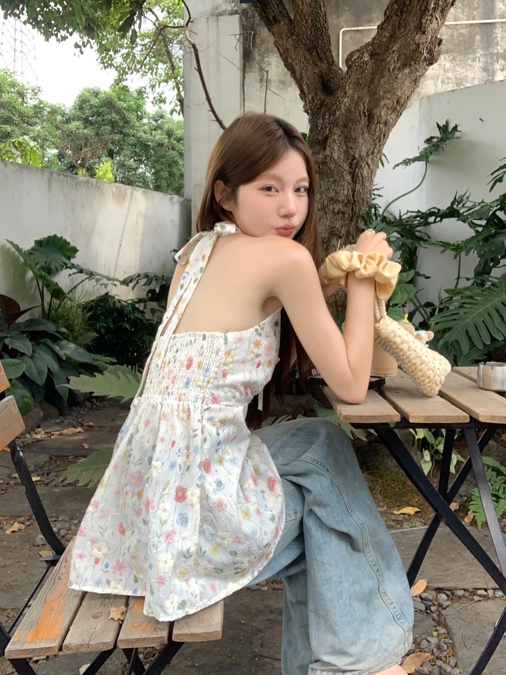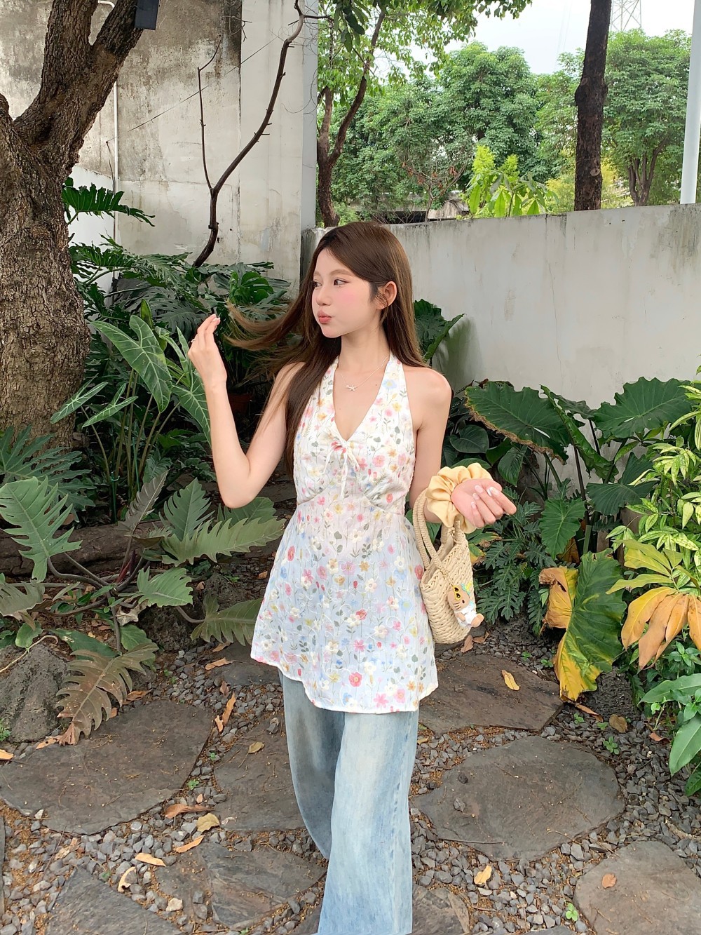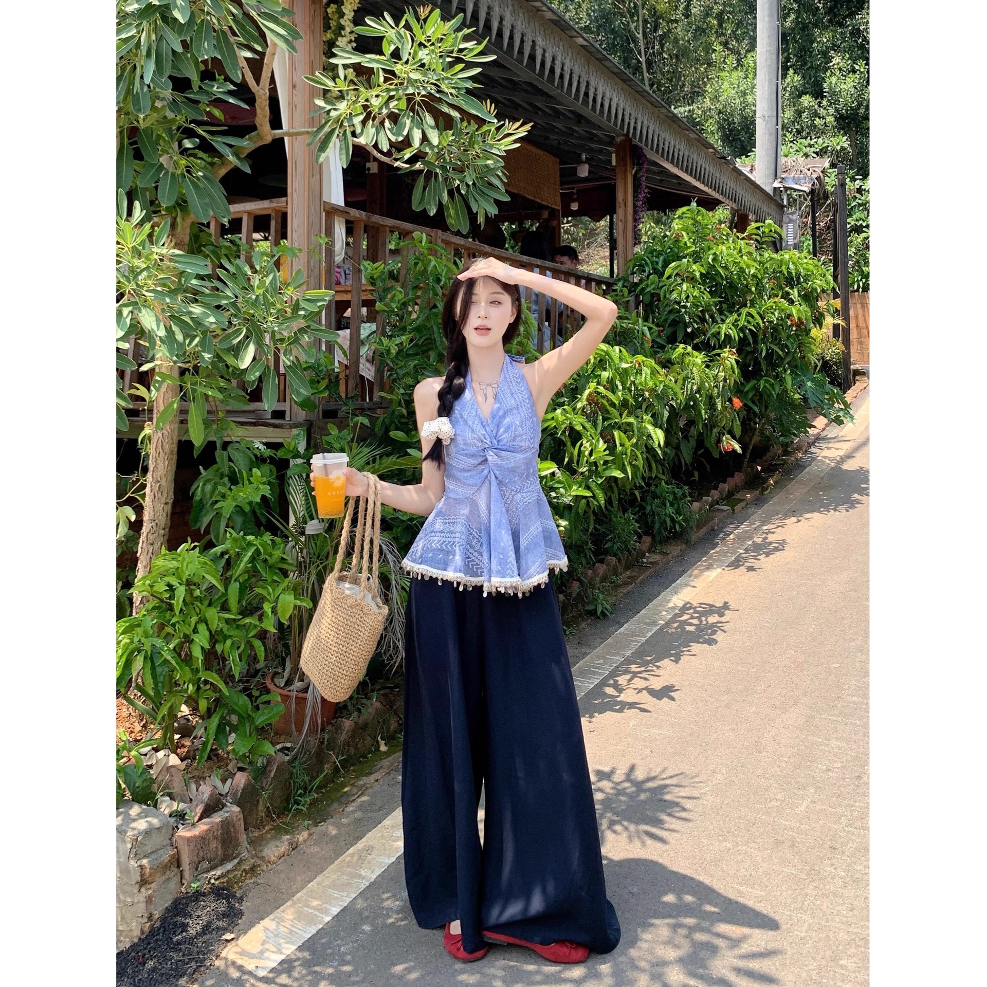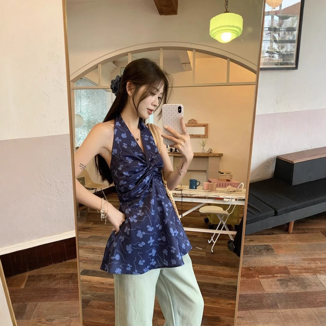 フレンチブルー花柄ホルターネックキャミソールレディース2025年夏新作ウエスト痩身Vネックレトロトップ