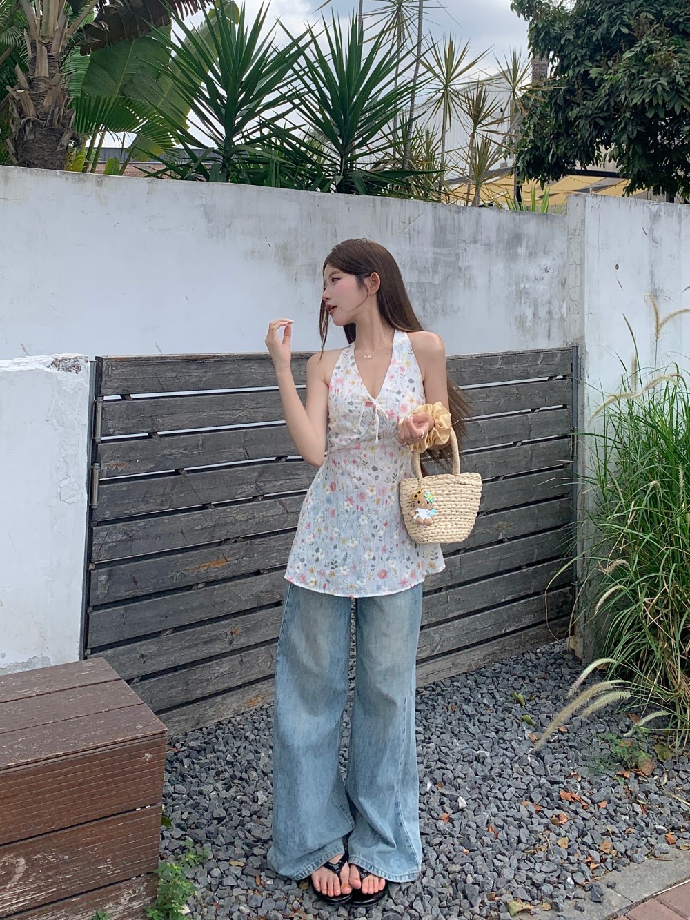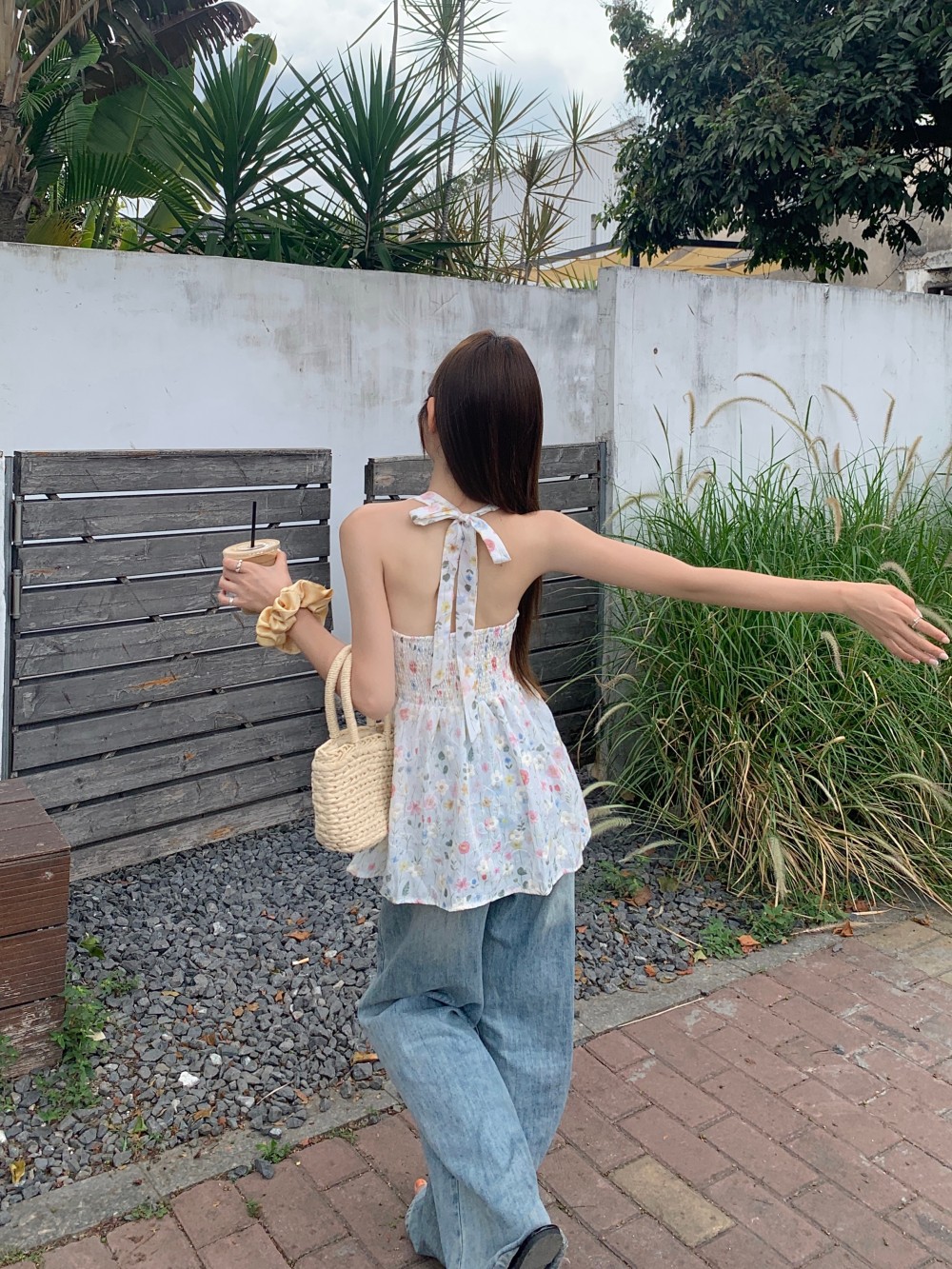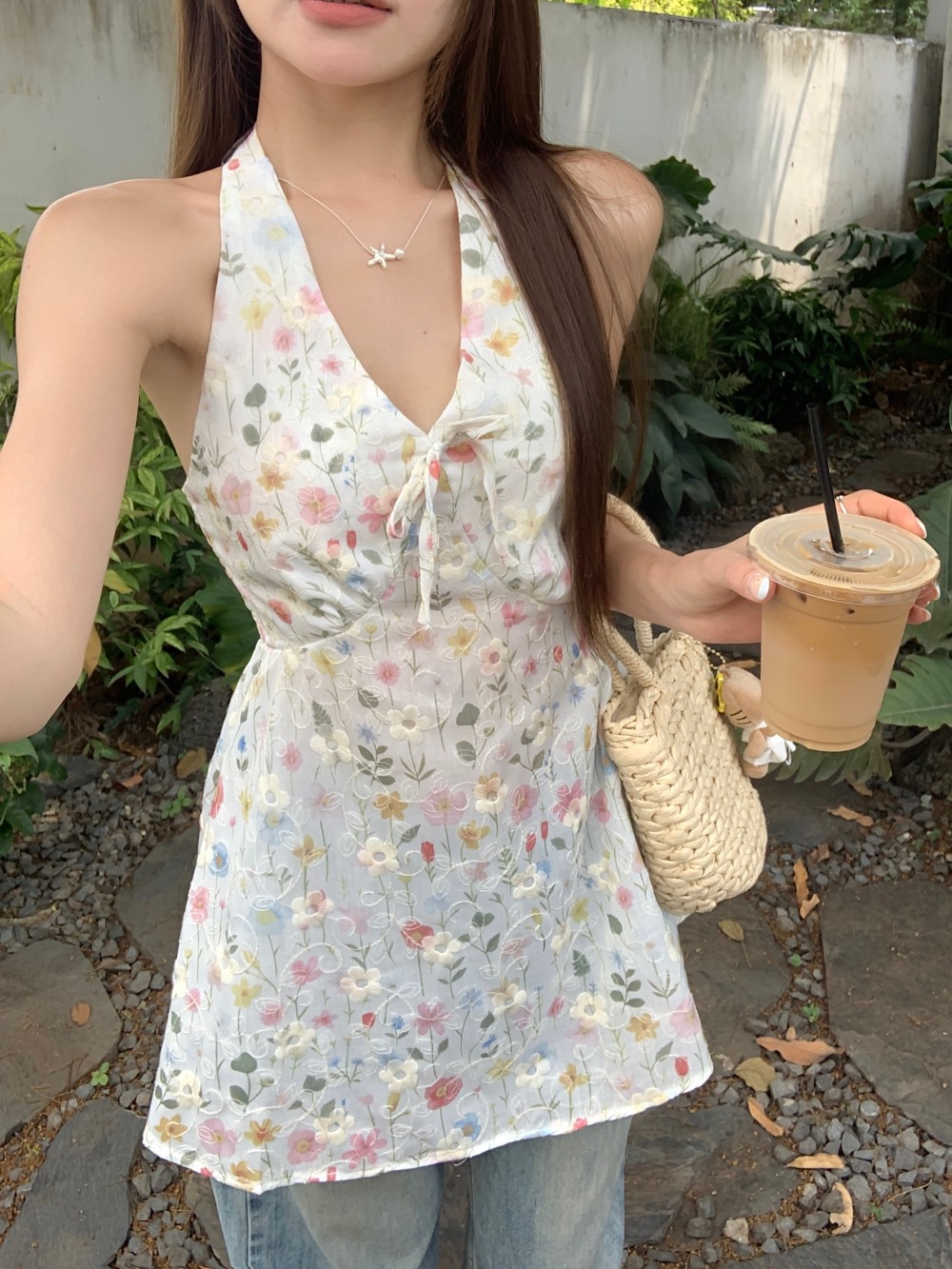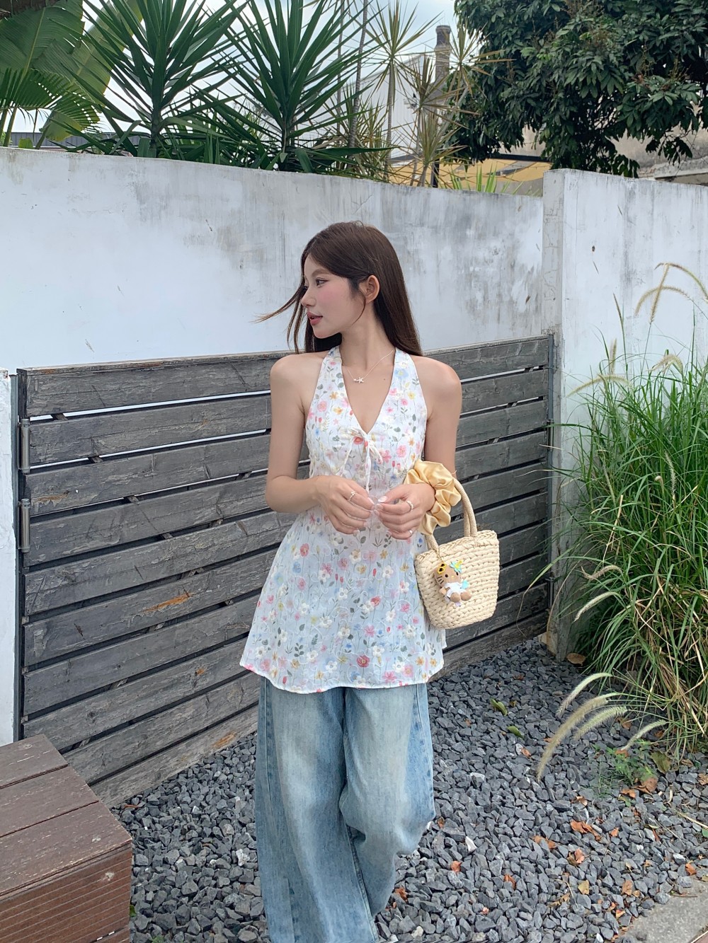 フレンチブルー花柄ホルターネックキャミソールレディース2025年夏新作ウエスト痩身Vネックレトロトップ