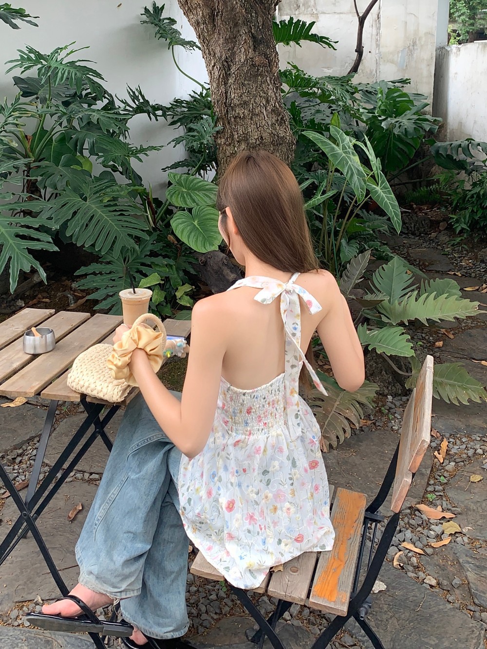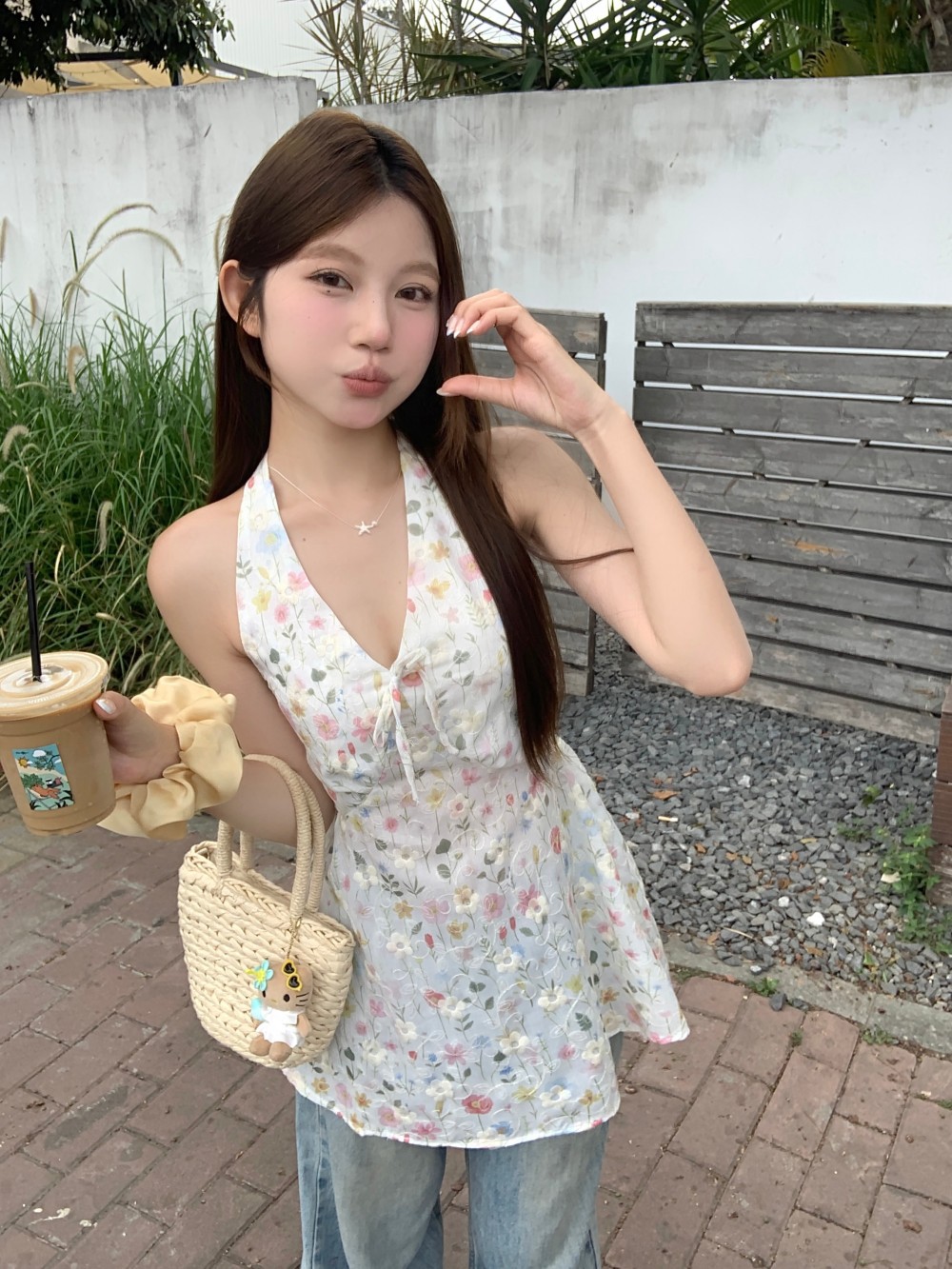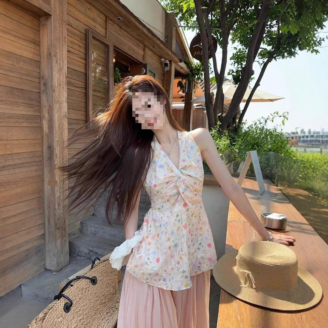 甘い花柄ホルターネック V ネックノースリーブベスト女性のための 2025 夏の新しい気質ウエスト痩身サスペンダートップトレンディ