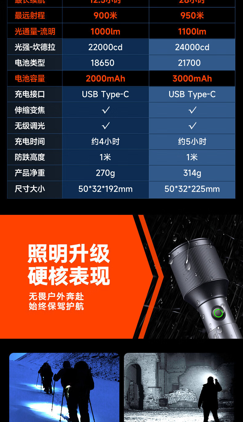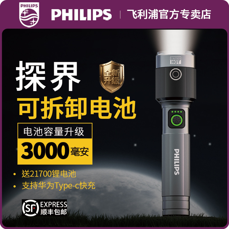 飞利浦手电筒变焦超亮Type-C充电家用小型户外露营灯应急SFL2146
