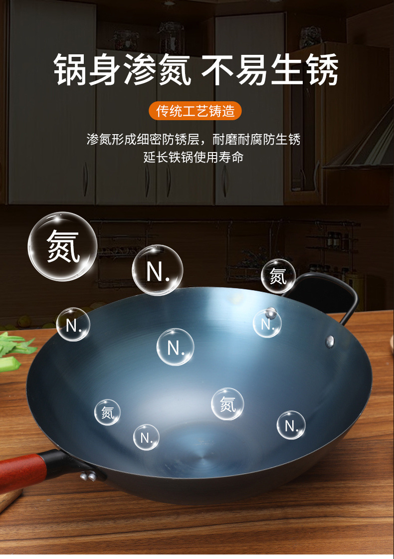 ねじ滑り止め底窒化円底家庭用炒め鍋コーティングなしガスコンロ熟鉄炒め鍋卸売り
