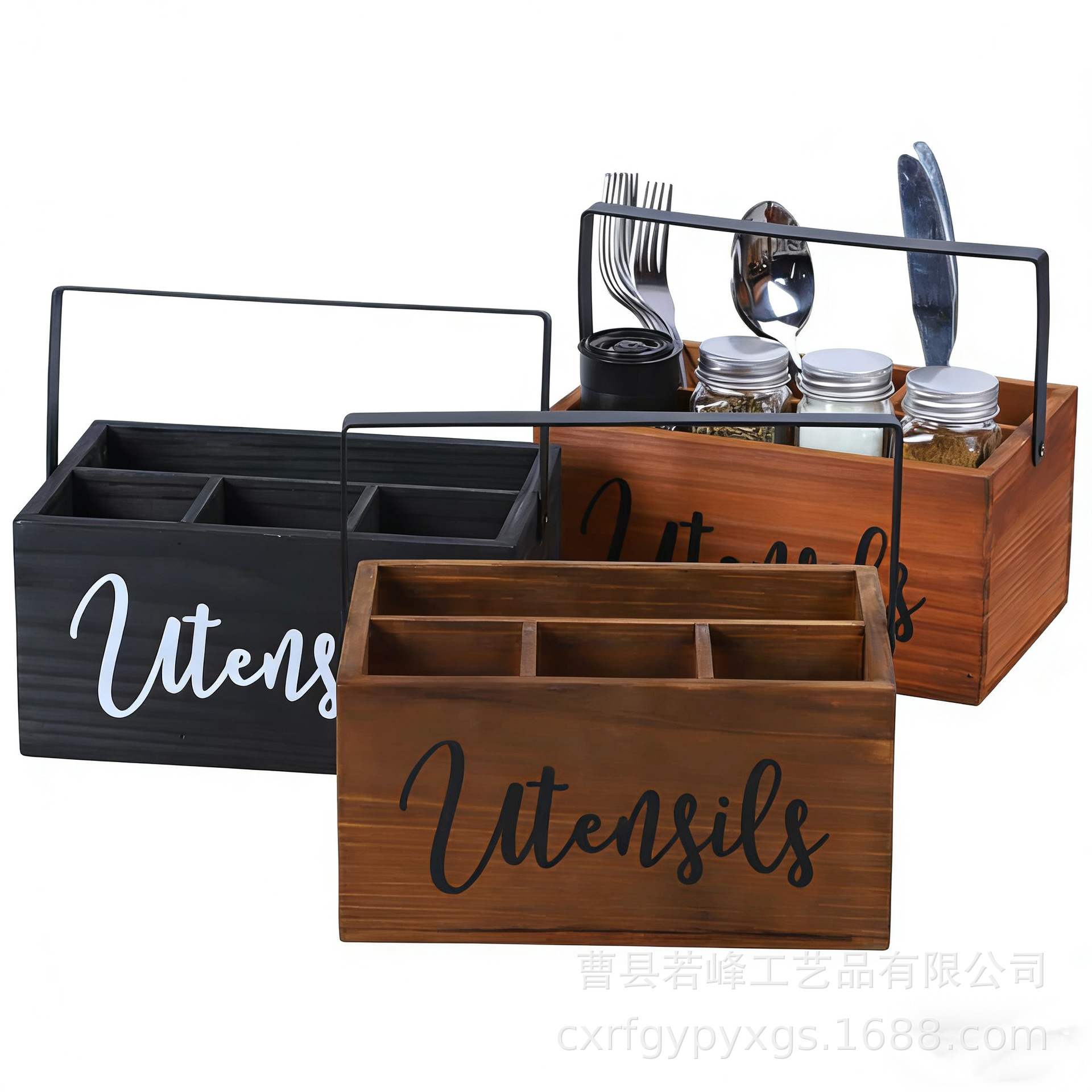 跨境木质餐具收纳盒可手提厨房刀叉筷子收纳盒酒水饮料储物盒酒提