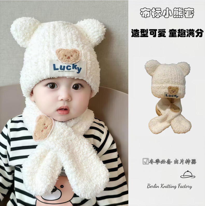 婴儿帽子秋冬季毛绒围巾两件套宝宝男女童小熊可爱保暖加厚幼儿帽