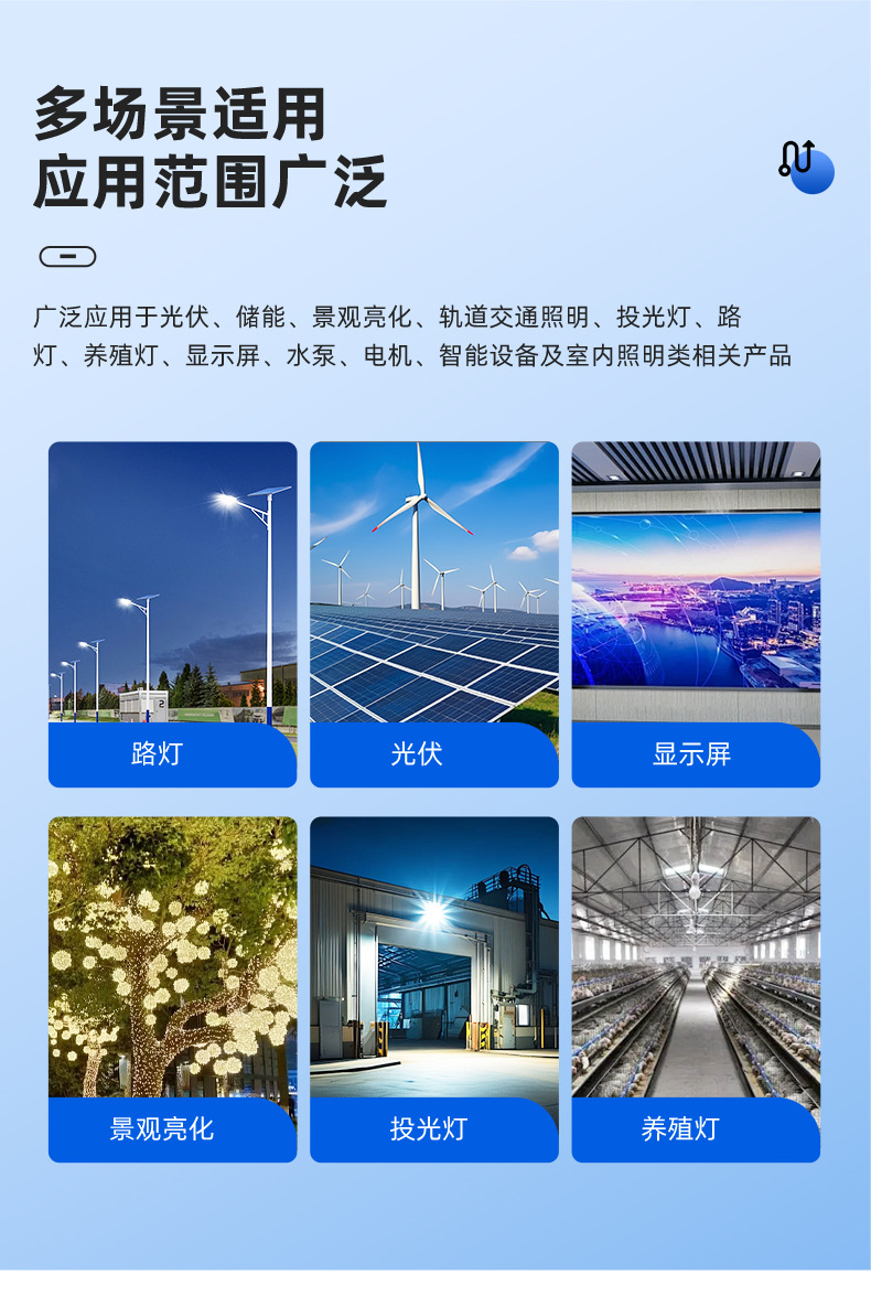応用分野 鉄道照明、投光器、街路灯、飼育灯、ディスプレイ、ポンプ、モーター、インテリジェント機器、室内照明