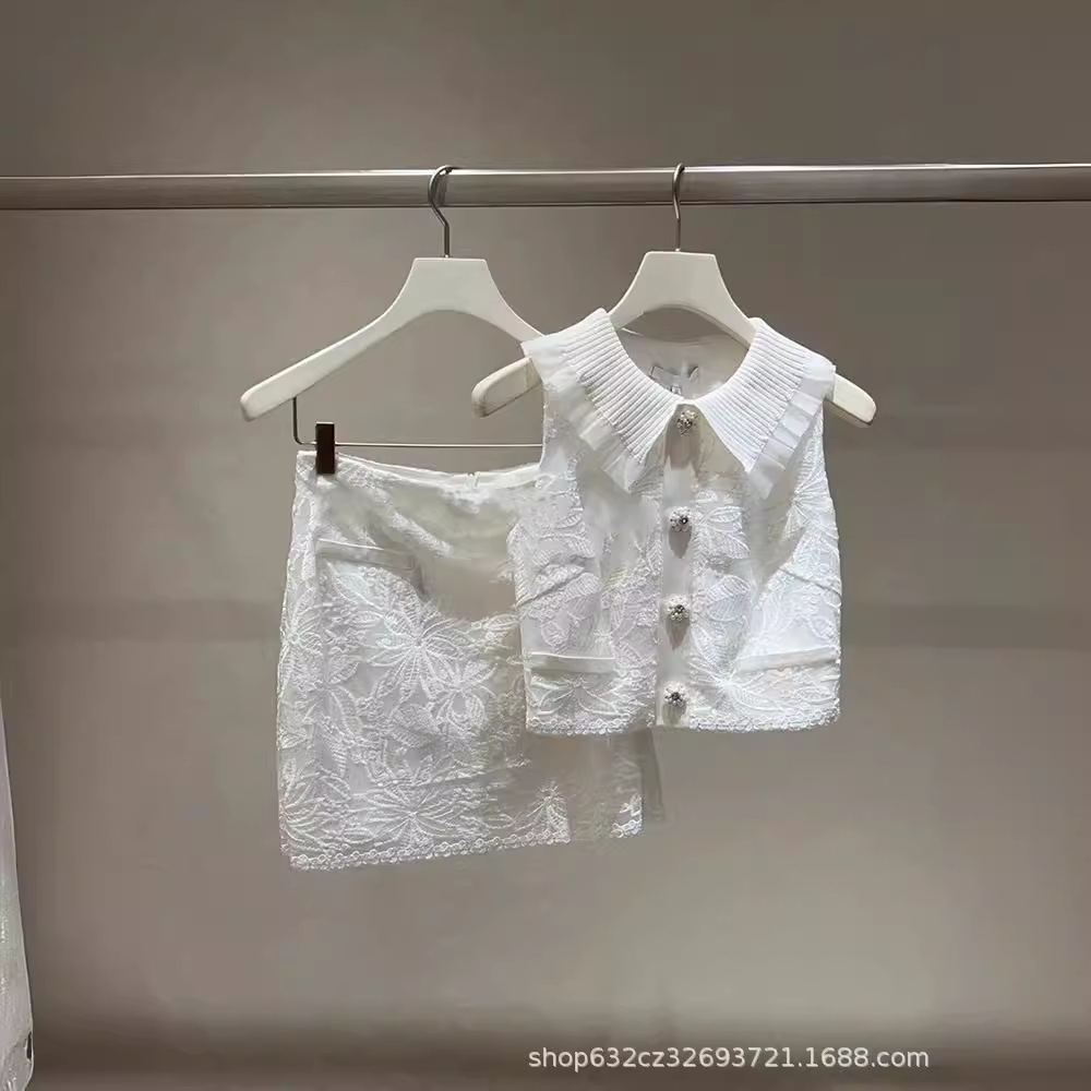 気質の小さい香りの風のフックの花の刺繍のベストの女性の2024夏の高級感の優雅なファッションの半分のスカートの2つのセット