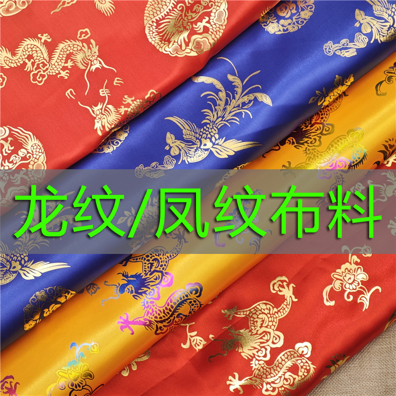 金箔龍と鳳凰模様のサテン生地、赤と黄色の仏陀の服、寿服生地、龍のローブ、龍と鳳凰のキルト生地