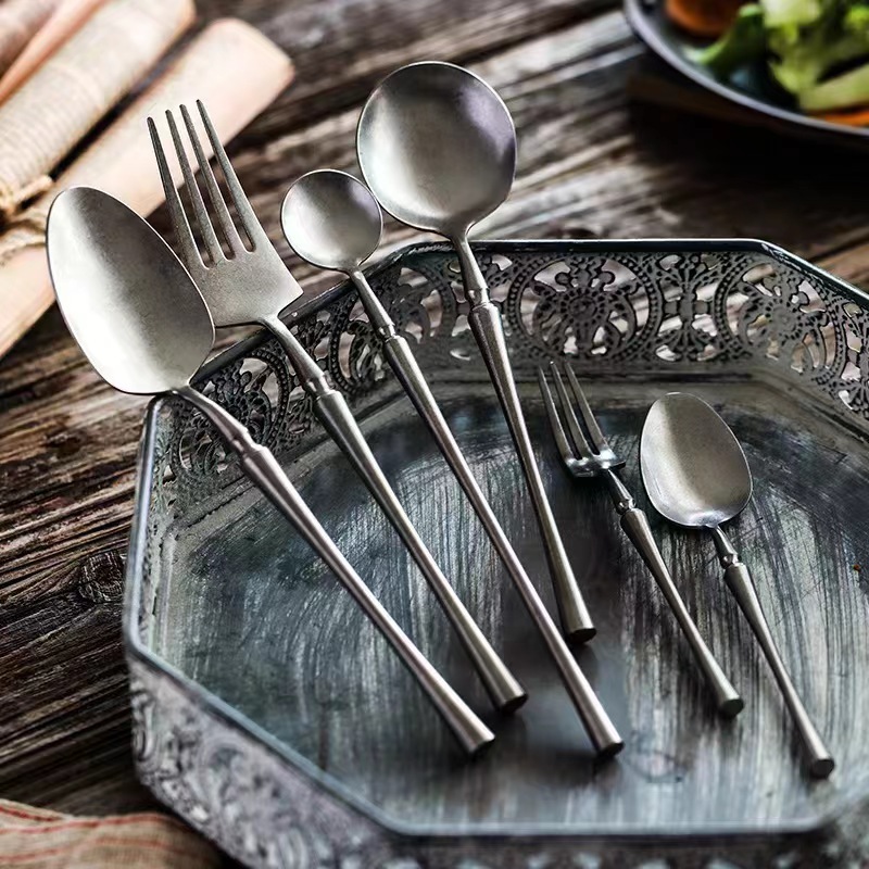 304ステンレスの食器の刀のフォークのステーキの刀の小さい腰は古い復古の振動をして甘いもののスプーンのコーヒーのスプーンを投げます。