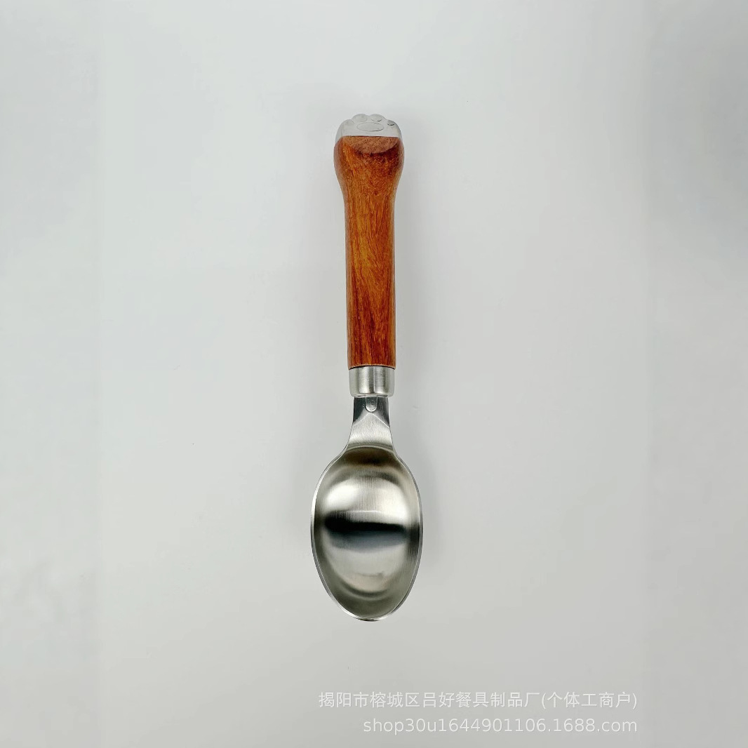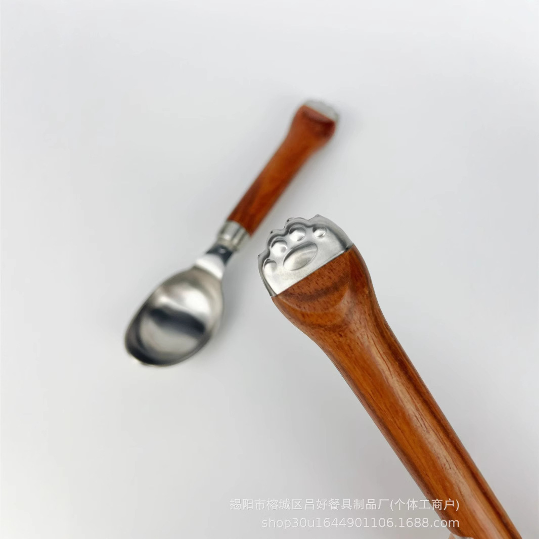 316L不锈钢勺子猫爪木柄平底圆勺嗦粉家用吃饭汤勺螺蛳粉汤匙调羹