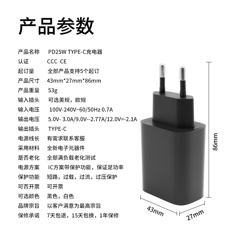 PD25W携帯電話急速充電器、EU CE認証取得、SamsungとAppleの携帯電話に適しています、欧州規格充電器ヘッド