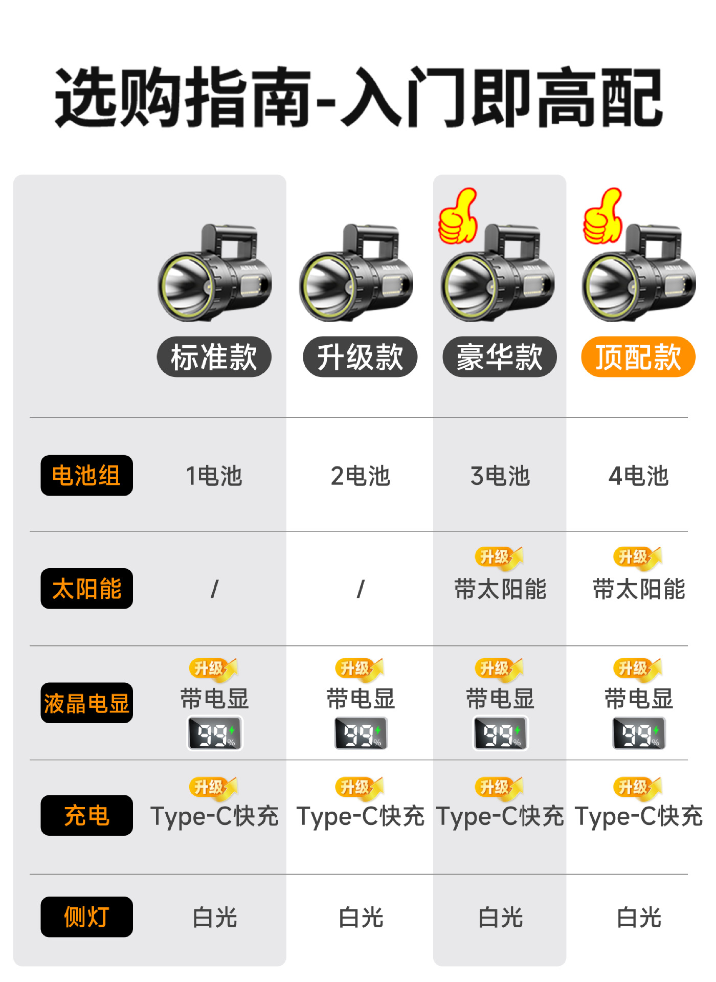 標準モデル 7000W I SST-40 ランプビーズ _ バッテリー寿命 8 時間 _ 単一リチウム電池 _ 太陽エネルギーなし,アップグレードされた 8000W I SST-40 ランプビーズ _ バッテリー寿命 16 時間 _ デュアル リチウム バッテリー _ 太陽エネルギーなし,豪華版9000W _ SST-70 LED搭載 _ 25時間連続点灯 _ 三元系リチウムイオンバッテリー3個使用 _ ソーラー充電対応,最高級モデル 9900W I 超高輝度 SST-90 LED搭載 _ 30時間連続点灯 _ 4セルリチウムイオンバッテリー _ ソーラー充電対応