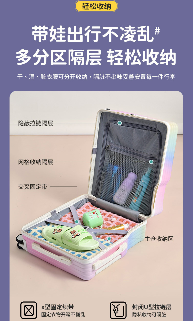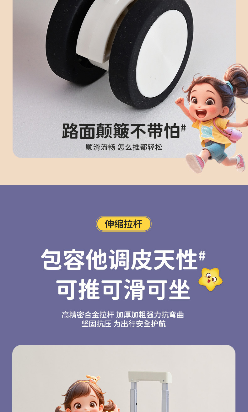 新しい子供用スーツケースは、ユニバーサルホイール付きで乗れるトロリーケースです。パスワード付きの機内持ち込み用スーツケースは、子供連れ旅行のための素晴らしいツールです。