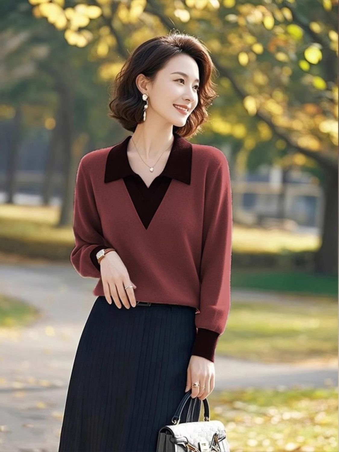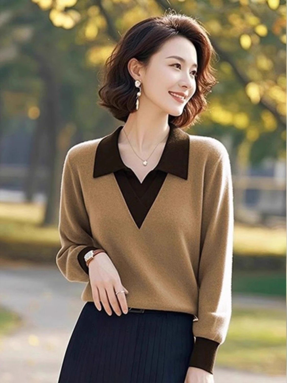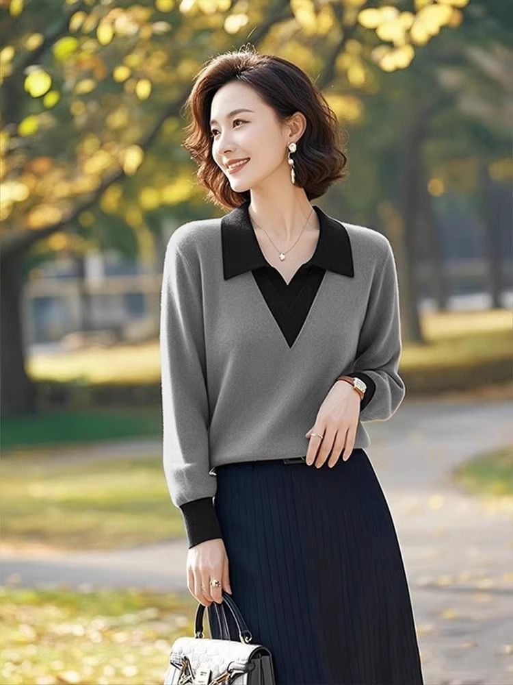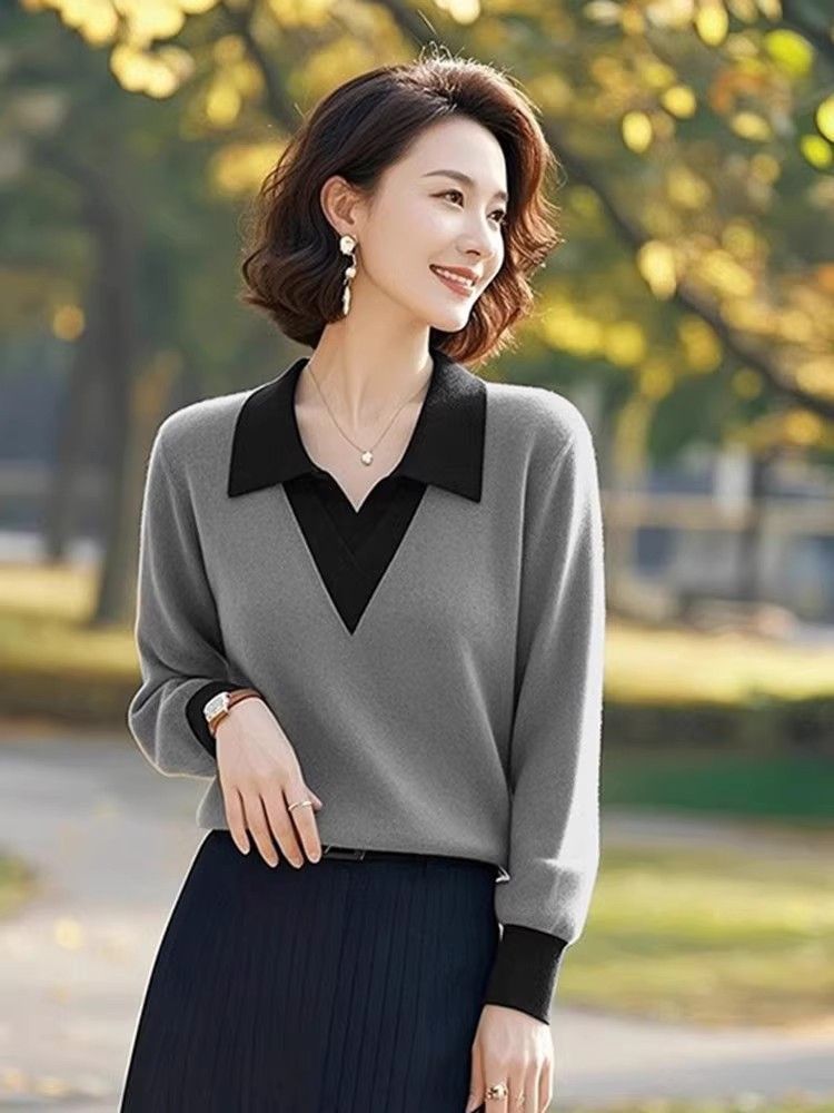 新款2025春秋季假两件针织翻领宽松针织衫打底显瘦毛衣洋气上衣