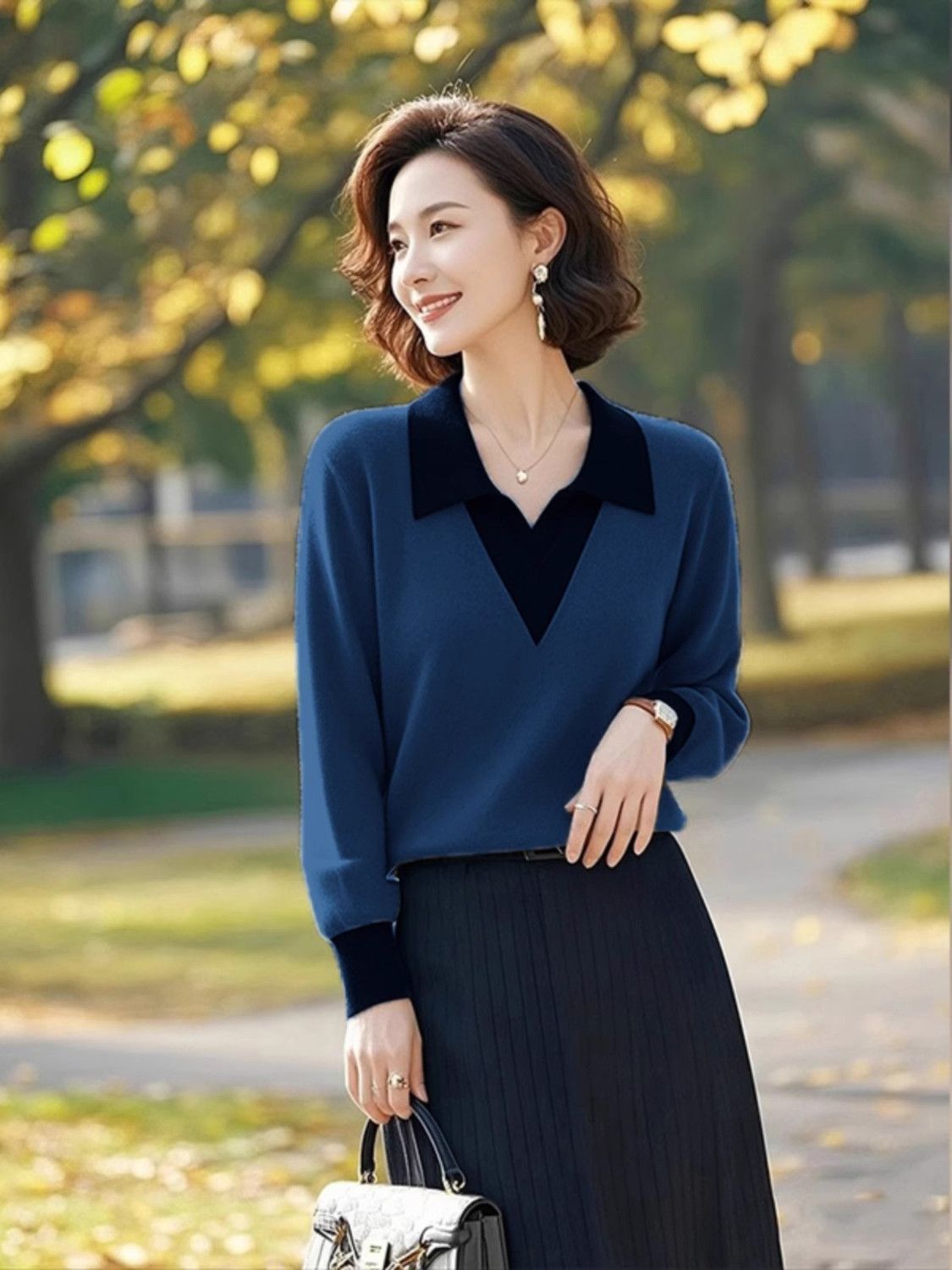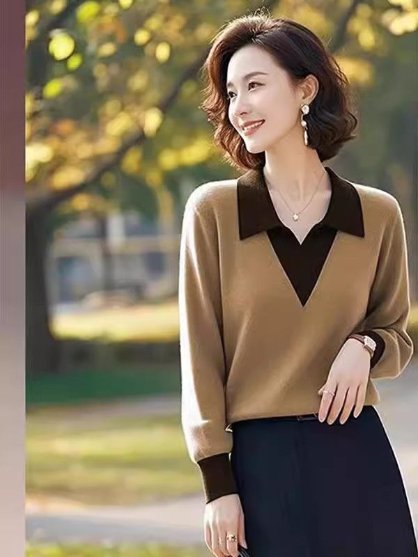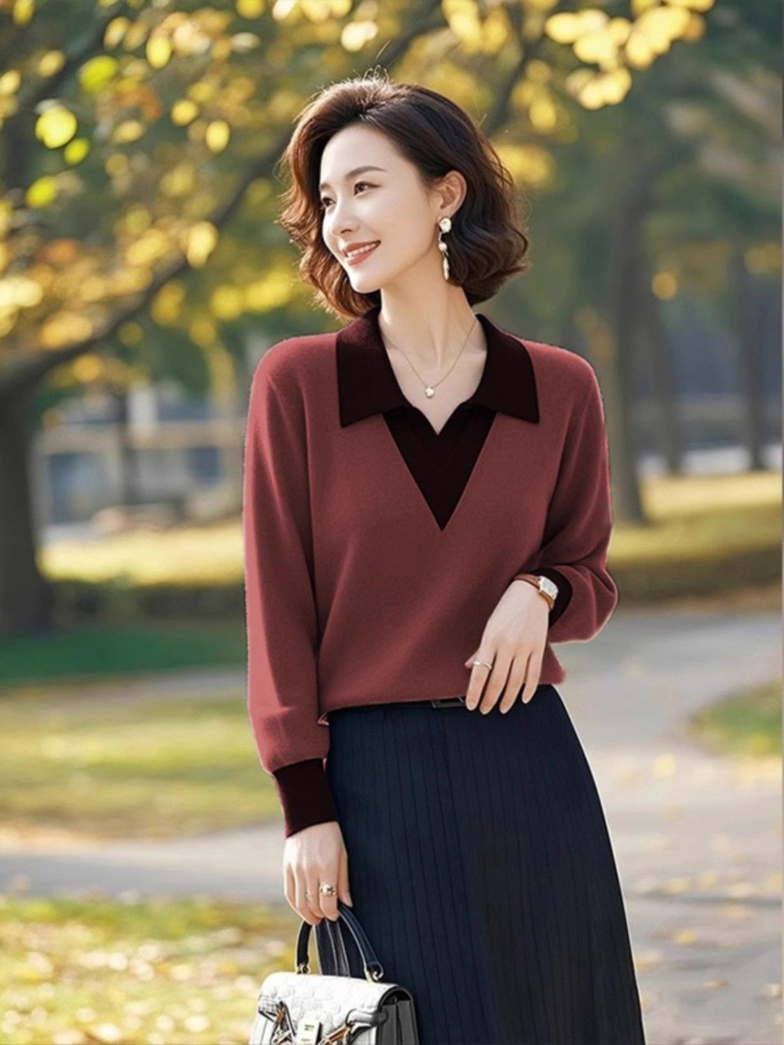 新款2025春秋季假两件针织翻领宽松针织衫打底显瘦毛衣洋气上衣