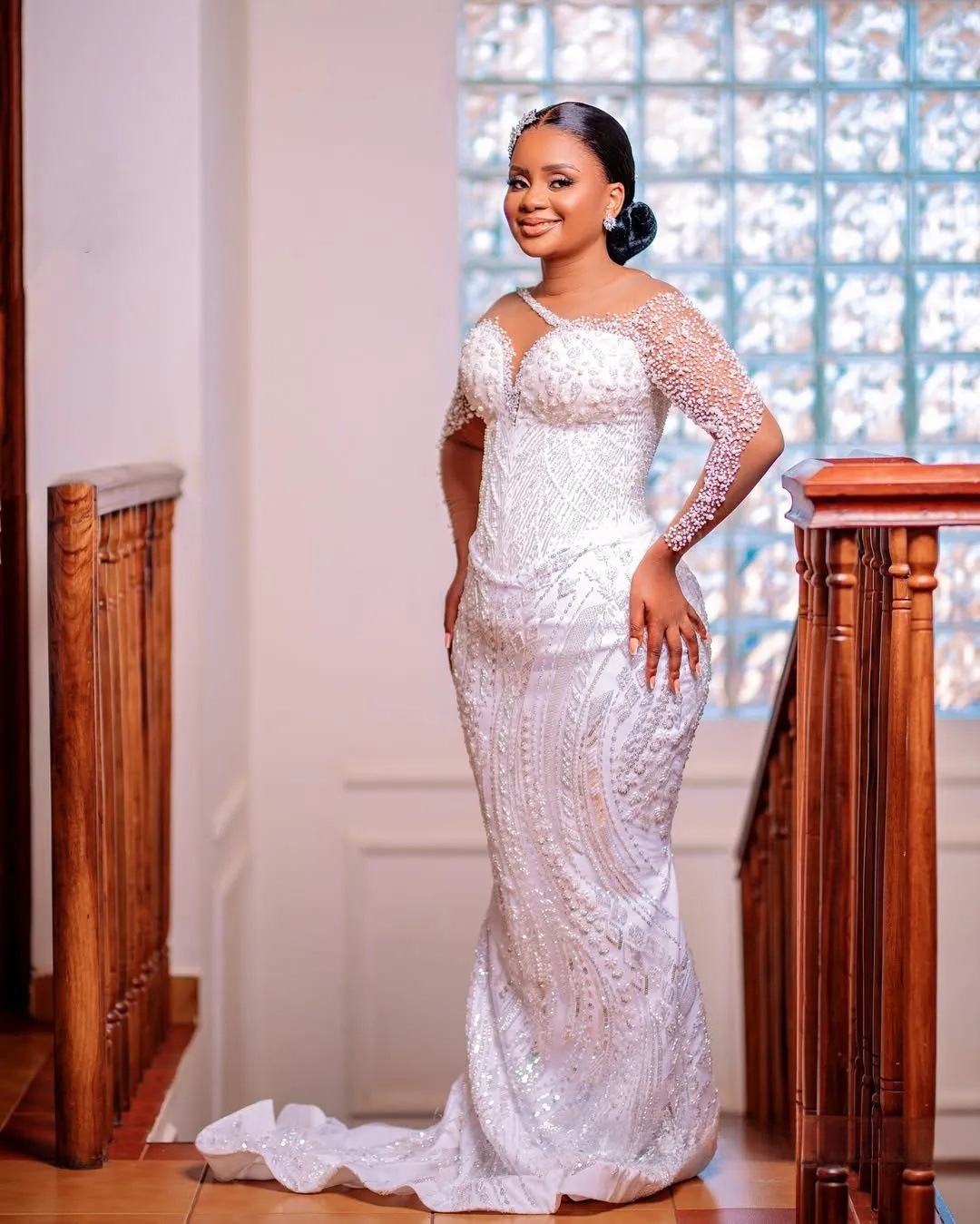 黑人新娘的美人鱼白色婚纱透明颈珍珠串珠缎面非洲花园新娘