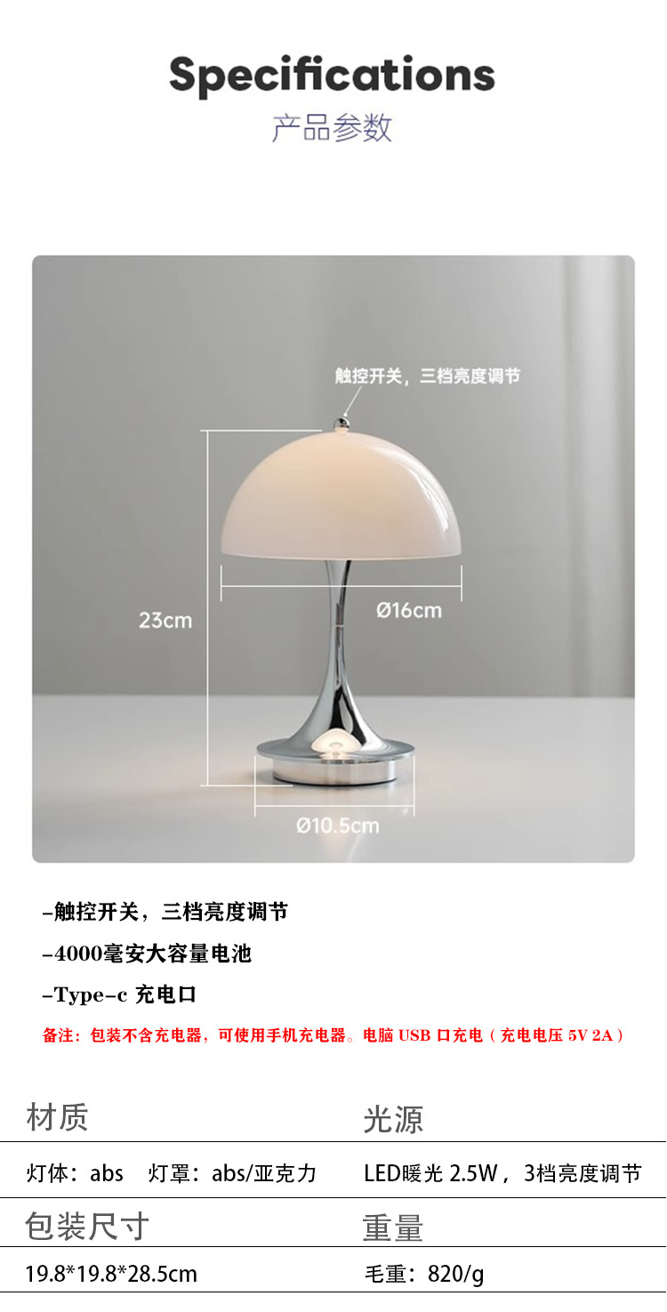 丹麦Panthella蘑菇台灯卧室床头灯充电便携LED可调光触摸氛围灯