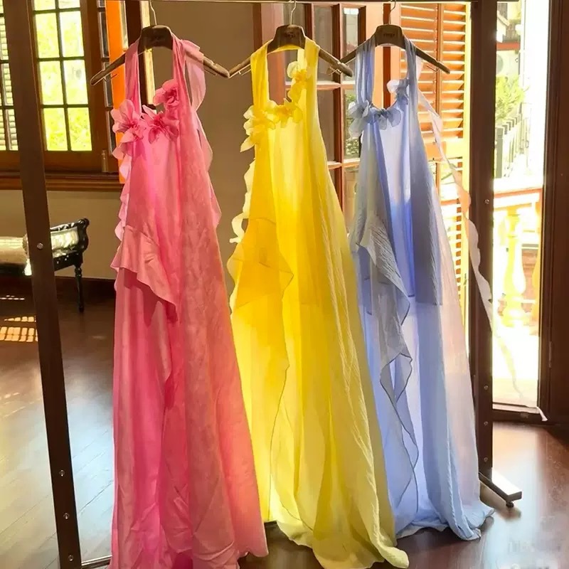 スポット王楚蘭と同じスタイルのホリデースタイルフラワーホルタードレス女性の夏の不規則な質感の妖精スカート