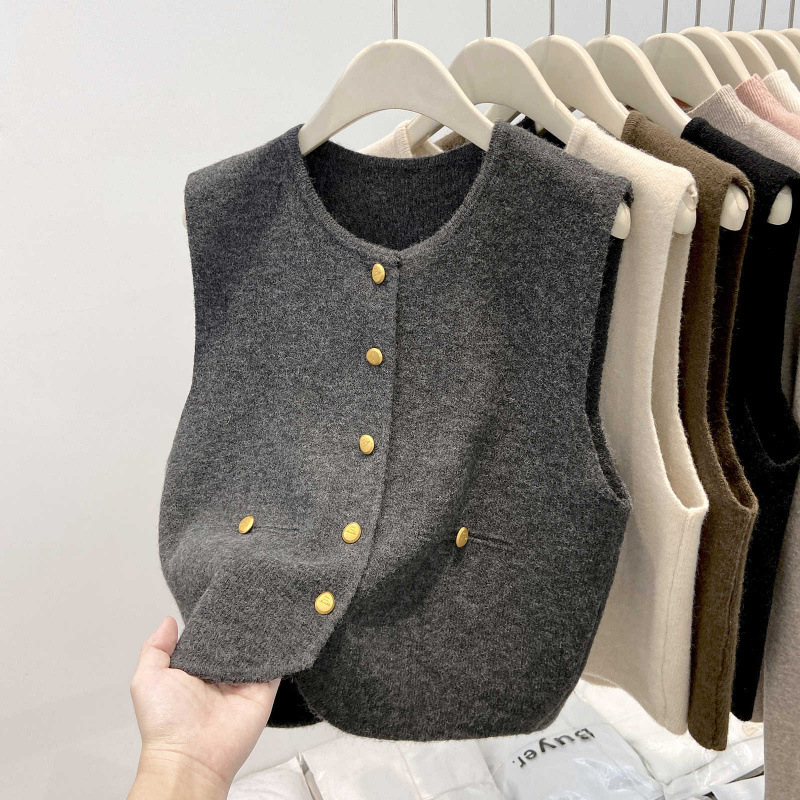 女性のためのハイエンドゴールドバックルニットベストカーディガン2025春と秋の新しい和風レイヤードルーズアウターセーターベスト