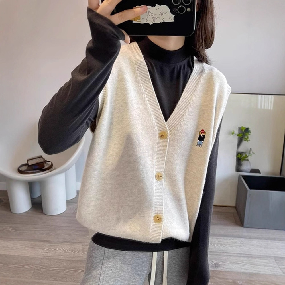 减龄卡通刺绣宽松v领针织马甲秋季洋气叠穿无袖开衫外穿百搭背心