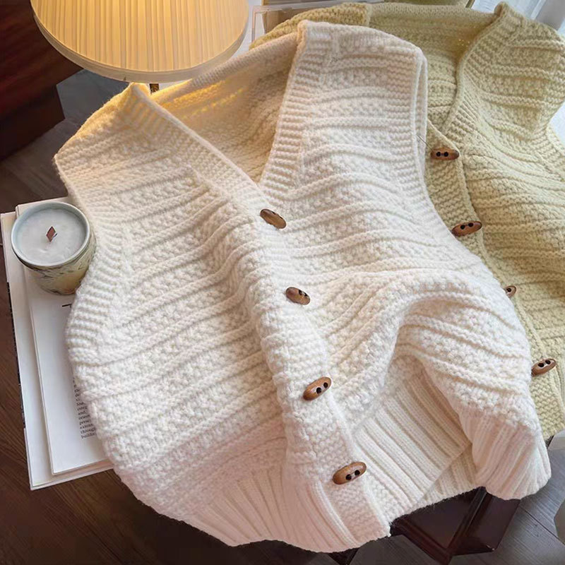 法式复古气质针织马甲女韩版宽松v领牛角扣无袖坎肩叠穿马夹上衣