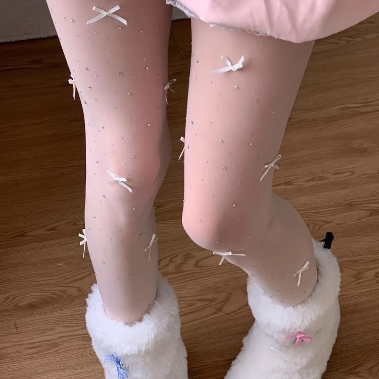 ホットダイヤモンドリボンストッキング女性の夏薄いロリータストッキング女性無地フラッシュダイヤモンド白抗スナッグ美脚ソックス