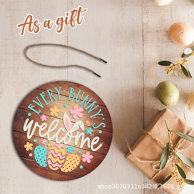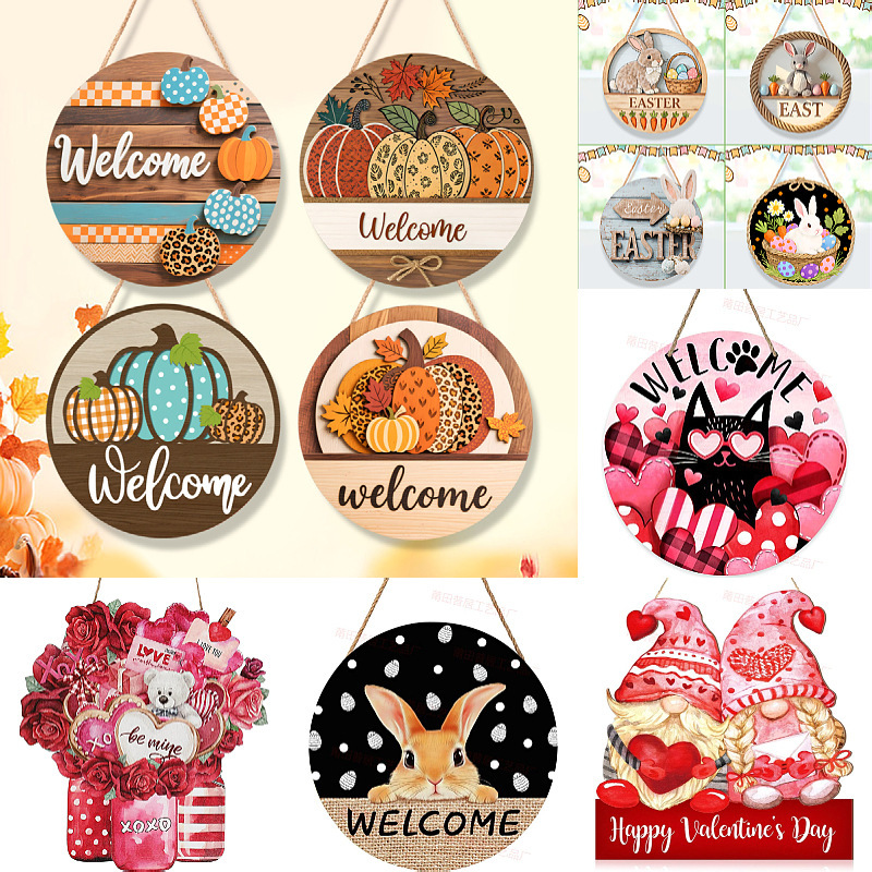 跨境热销复活节圆形木质挂牌欢迎语标志装饰派对墙面挂件装饰品