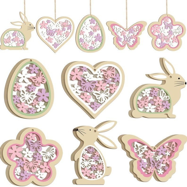 24件套悬挂装饰套装春季装饰吊坠木制复活节装饰品兔子复活节木质