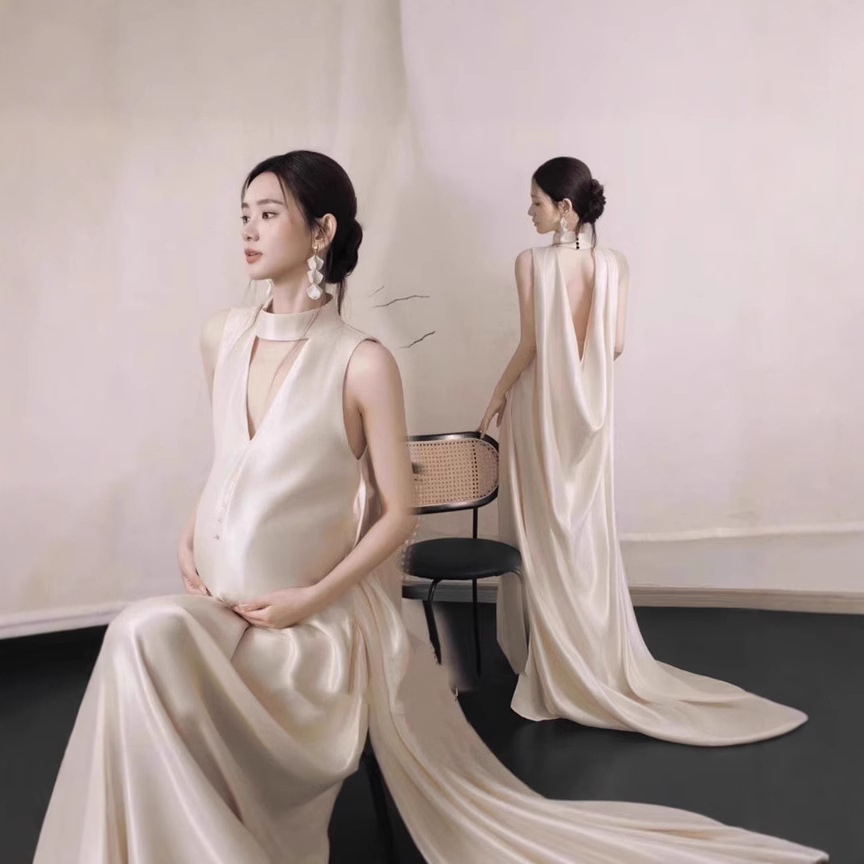 影楼新款时尚高级感孕妇室内简约风白色连衣裙写真摄影艺术照服装