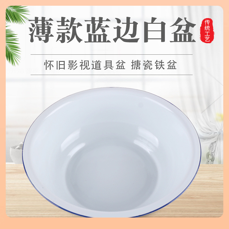 ⊿昔ながらのエナメル青縁白鉢 大鉢 洗面鉢 洗濯鉢 小道具 手洗い鉢 薄型 裏洗い鉢 直火対応