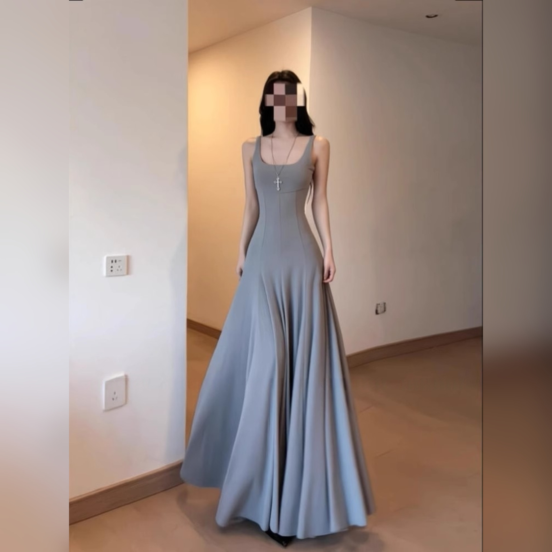 フランスの高級スクエアネックグレーサスペンダードレス女性の夏のヘップバーンスタイルウエストタイトロングスカート