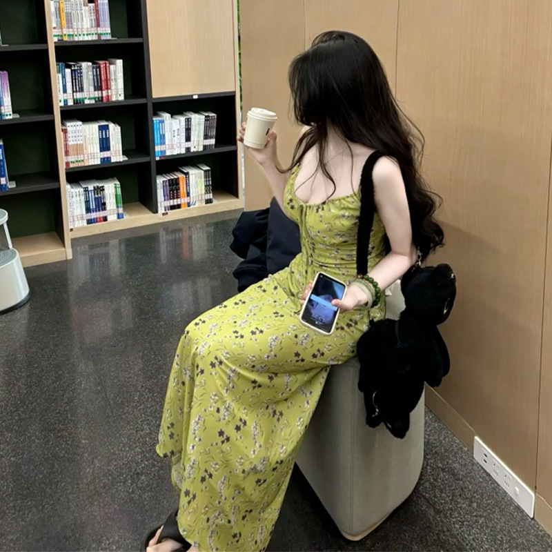 フレンチグリーンサスペンダー花柄ドレス女性のための夏の2025新しいホットスタイルホリデースタイル美しいロングスカート