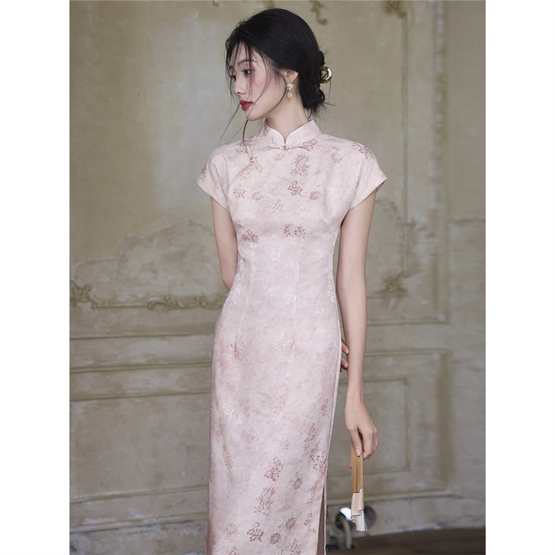 古法半開襟人綿ジャカードチャイナドレス2024夏新中国式レトロ気質少女ピンクワンピース
